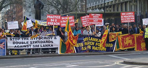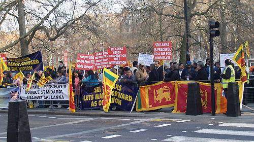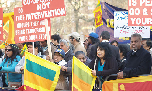 Hundreds of peace loving Sri Lankan expatriates converged outside the American Embassy in London on Sunday 11 March to protest against the United States sponsored resolution on Sri Lanka at the ongoing United Nations Human Rights Council (UNHRC) in Geneva.