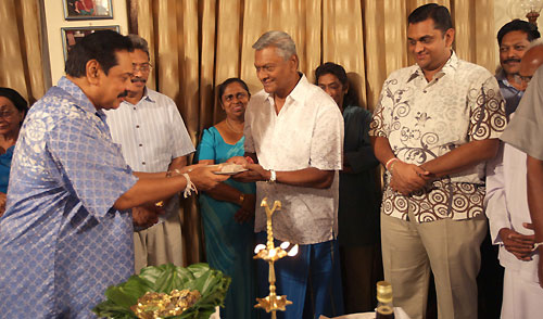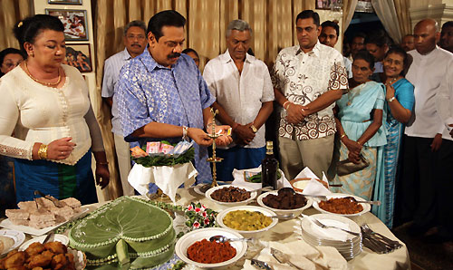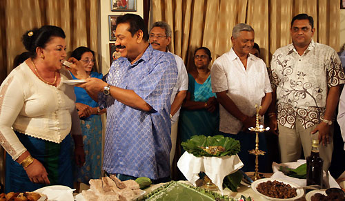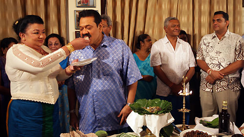 The Sri Lanka’s first family including President Mahinda Rajapaksa also celebrated the Sinhala and Hindu New Year rituals at Carlton Residence in Tangalla, Hambantota yesterday on 13 April. First Lady Shiranthi Rajapaksa conducted all the rituals at the auspicious time with the President Rajapaksa and other family members assisted her. The auspicious time for the lighting of the hearth was at 7.42 pm. President Mahinda Rajapaksa and First Lady Shiranthi Rajapaksa and many other family members attended the symbolic tradition of boiling milk at the auspicious time. As mentioned by astrologers milk rice was prepared with jaggery and ghee, attired in white and blue colours and facing the Southern direction. The auspicious for partaking of the first meal for the New Year was at 10.28 pm. In addition to taking the first meal, transactions were also conducted, attired in blue and white colours and facing the south. President Rajapaksa, the pilot who crafted the environment for the entire nation for the partaking of the meal prepared with new rice of a new yield, also joined in this tradition setting an example for the whole country. President Rajapaksa's brothers, Speaker of the Parliament Chamal Rajapaksa, Defence Secretary Gotabhaya Rajapaksa and nephew, Chief Minister of the Uva Province Shashindra Rajapaksa and many other family members participated the celebrations. They all are seen here with locals and President’s close supporters enjoying Sinhala Avurudu traditions at Carlton House. President Mahinda Rajapaksa also participated in the traditional transaction of the New Year and took part in the celebration of the New Year in warm fellowship with the people of the area. The President did not forget to perform the tradition that is undertaking transactions for the New Year by visiting the Bank of Ceylon and People’s Bank branches in Tangalla. People’s Bank Chairman W. Karunajeewa was present at the occasion. The state sponsored oil anointing ceremony for the New Year will take place on Sunday 15th at the auspicious time of 7.08 am at the Natha Devalaya premises of the Sri Dalada Maligawa under the patronage of Prime Minister D.M. Jayaratne. Pix by: Sudath Silva