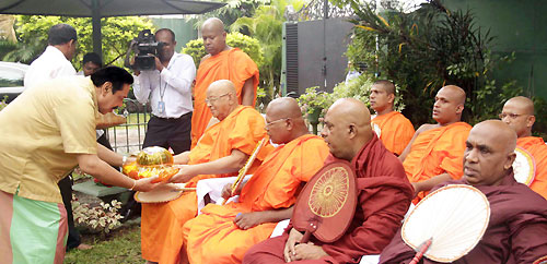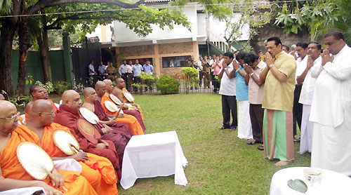 President Mahinda Rajapaksa performed the oil anointing ritual this morning at the auspicious time of 7.08 am (Sunday 15 April) at the Carlton house in Tangalle. The Chief Sangha Nayaka of the Southern Sri Lanka and the Chancellor of the Ruhunu University Rajakeeya Panditha Ven. Pallaththara Sumanajothi Nayaka Thera performed the rituals by anointing oil on the President’s head. As instructed by the Ministry of Indigenous Medicine, Department of Ayurveda, Sinhala New Year Auspicious Times Committee and astrologers, oil anointing was performed by facing the North with Imbul leaves placed on the head and Nuga leaves under the feet and attired in golden colour. Several invited guests were amongst a large number of people who were present at the ceremony.