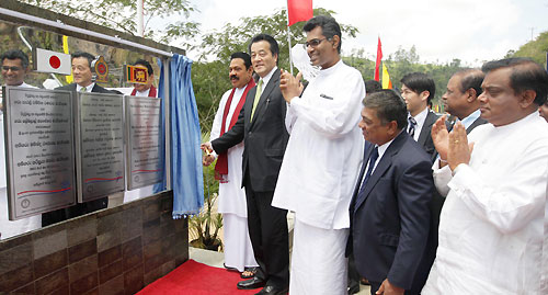 The sluice gate of the main dam of the Upper Kotmale Hydro Power Project was declared open by President Mahinda Rajapaksa and the Japanese Deputy Premier Katsuya Okada. The plaque of the project was unveiled by the Sri Lankan President and the Japanese Deputy Premier and after that Jasmine flowers were strewn to the reservoir by both leaders. Subsequently the second and third sluice gates were also opened. Minister of Power and Energy Patali Champika Ranawaka, said 96% of the construction of the hydro power plant has been completed and that 150 megawatts of electricity will be added to the national power grid. Upper Kotmale Hydro Power Project is scheduled to finish construction in June 2012. The Minister further said that the project was initiated under Japanese aid of ¥en 37,817 million and Ceylon Electricity Board has also chipped in with over 8.5 billion rupees towards the construction work. Japanese Ambassador in Sri Lanka Nobuhito Hobo, Sri Lankan Ambassador in Tokyo, Admiral Wasantha Karannagoda, Ministers Champika Ranawaka, Susil Premajayantha, Navin Dissanayake, C.B.Rathnayake, Mahindananda Aluthgamage, Deputy Minister Premalal Jayasekara and several other dignitaries participated in the observation tour. The 12.9 km long, Sri Lanka’s longest underground tunnel of the Upper Kotmale Hydro Power Project was declared open by President Rajapaksa in November 2010. At present the power project generates 75 mega watts of electricity and once the project is completed its full output will add 150 mega watts of power to the national grid. Japanese Deputy Premier Okada arrived in Colombo on Friday (04 May) for a two-day official visit to coincide with marking 60 years of diplomatic relations between both countries. He is also expected to visit Akkarayan Kulam Tank, Sub Grid Power Station at Anathapuram in Kilinochchi, Dry-fish project in Velanai and Coconut Development Farm in Achchuveli in the northern region of Sri Lanka and several key Japanese funded projects. Pix by: Sudath Silva