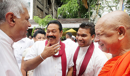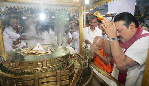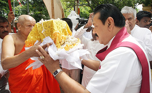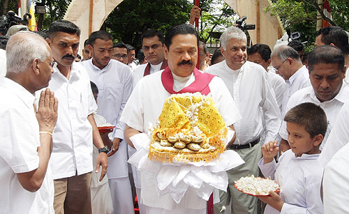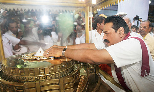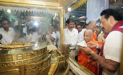 The Sacred Kapilawasthu Relics have been accorded the status of a Head of State in Sri Lanka. President Mahinda Rajapaksa, first lady Madam Shiranthi Rajapaksa, opposition leader Ranil Wickramasinghe, Namal Rajapaksa MP, Secretary to the President Lalith Weeratunga, ministers, parliamentarians and officials worshipped the relics at the Gangaramaya this morning. President Mahinda Rajapaksa and his elder son, Namal MP visited each one of the sites where the relics are on display. They have inspected arrangements personally and have offered worship. Hundreds of thousands of devotees from all corners of the country have lined up in queues for long hours to pay homage to Sacred Kapilawasthu Relics. Well before the start of the exposition, a large number of people gathered to pay homage to the Sacred Relics and it was estimated that around 300,000 were waiting at the start of the exposition. The Chief incumbent of the Gangarama Viharaya Venerable Galaboda Gnanissara Nayaka Thero said that arrangements have been made for elders, pregnant mothers, mothers with small children and the differently abled to worship the relics without having to stand in line. Venerable Thero said the queues were in extent of over three kilometers and large number of devotees had already paid homage to the Sacred Relics at the Viharaya. The devotees waited patiently outside the temple in the extremely hot and humid weather that is prevailing in Colombo at present. Some devotees had come to the venue the day before and had spent the night outside the temple being exposed to the elements. Earlier, the relics were brought to Galle Face in a special bulletproof helicopter and then a motorcade to the venue of the exposition. On arrival at Hunupitiya Gangarama temple in a colourful procession which was led by Buddhist flag bearers, colourful drummers and dancers the relics casket was handed over to the chief incumbent of Gangarama temple Ven. Galaboda Gnanissara Thero. President Mahinda Rajapaksa placed the relics in a special pavilion. All along the way, Jasmine flowers and lotus petals were strewn to welcome the Sacred Relics. A special Anusasana was delivered by the Mahanayake of the Asgiriya Chapter Most Ven. Udugama Sri Buddharakkhitha Mahanayaka Thero. The venue of the exposition was decorated with Buddhist flags and hoardings. The temple surrounding wore a festive look with hoardings and buntings all around the streets. This is a normal sight that has become familiar across Sri Lanka since the Kapilavasthu relics arrived in the island from mid-August. Thousands of people, young and old, all clad in white, the colour associated with purity and peace among Buddhists, wait hours in the queues round the clock on end for a second’s glimpse of the Sacred Relics that Buddhists consider noble and divine. They all get just about enough time to offer their prayers and move on. Venerable Dr Kirinde Assaji Thero said that Sri Lanka Transport Board as well as the Railways Department had taken measures to provide transport for the thousands of devotees that had flocked to Colombo. Ven Thero also stated that security was provided and ensured by Police and armed forces. Government and private organisations had organised ‘dansalas’ for devotees. The relics came from their ‘home’ in India, the National Museum in New Delhi on August 20. According to the schedule, the Sacred Kapilawasthu Relics were to be brought back to India on September 5. However, in response to a request made from the Government of Sri Lanka, New Delhi agreed to extend the exposition of the relics by a week up to September 12, a large number of Sri Lankan devotees were able to pay homage to the Sacred Relics. However the relics will be taken to Kelaniya Raja Maha Viharaya for the final exposition. The country, which had received scanty rainfall from the South-West monsoon, witnessed heavy showers after the relics arrived in Sri Lanka. Many worshippers both in government and lay people believe that relics brought the rains with them. However the opposition UNP has alleged that the government is deliberately taking it to places where provincial polls have been announced, while its leader Ranil Wickramasinghe has cast doubts over the authenticity of the relics. His remarks were drowned out by hundreds of leaders, big and small, from his own party and outside. Pix by: Sudath Silva ![]() ![]() ![]() ![]() ![]() ![]() ![]()