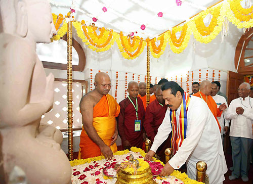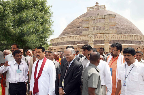 ![]() President Mahinda Rajapaksa laid the foundation stone for the construction of the International University of Buddhist and Indic Studies in the ancient Buddhist city of Sanchi in the presence of dignitaries from Bhutan, Myanmar, Thailand, Japan, Cambodia, Mongolia, Nepal and India. Prime Minister of Bhutan Jigmy Thinlay graced the occasion as a special guest. Chief Minister of India’s Madhya Pradesh Shivraj Singh Chouhan and Cultural Affairs Minister of Madhya Pradesh Lakshmi Kanth Sharma were among those present. President of the Sri Lanka Mahabodhi Society and Chief Sanghanayake of Japan as well as the Chief Incumbent of the Sanchi Buddhist Temple, Venerable Baanagala Upatissa Nayaka Thero was also present. In the meantime, before the laying of the foundation stone for the Buddhist University, dignitaries paid homage to the Holy Relics of Arahath Seriyuth Mugalan, the chief disciples of Lord Buddha. The President also joined in an observation tour of the Sanchi Stupa precincts after participating in religious observances. President Rajapaksa together with Bhutan's Prime Minister Jigme Yoser Thinley planted a sapling of the sacred Sri Maha Bodhi Tree in Mahamevna Uyana, Anuradhapura, Sri Lanka which is believed to be a sapling of the original Bodhi tree in Boddhagaya under which Buddha attained enlightenment 2600 years ago. It was specially brought from Sri Lanka to plant near the Sanchi Stupa. Addressing the ceremony, President Rajapaksa said that his journey to Sanchi, is primarily an act of gratitude on behalf of the people of Sri Lanka. Thanking for the historic opportunity to lay the foundation stone, the President said the Buddha's message of tolerance and understanding is of great relevance today, as the "tragic results of enmity and hatred towards other faiths leading to violence and destruction, and great loss to societies" are seen. "It is of equal importance in the East and West alike," said the President adding that undoubtedly there is a need to go back to the roots of civilizations and search for the wisdom that prevailed in the ancient world. "The Buddhist and Indic value systems that paved the way to modern concepts of human rights and fundamental freedoms need to be revived," the President noted. He expressed the hope that the University of Buddhist and Indic Studies will grow strong and the graduates of the University will be inspired by the Buddha's teachings. Recalling Mahatma Gandhi as the greatest son of modern India, he said people on both sides of the country have duty to spread the message of non-violence, peace and compassion to the world which is "trapped in material-based progress". The President pointed out profound contribution by Dr B.R. Ambedkar for the revival of Buddhist thought in India and his efforts to incorporate Buddhist and Indic values in the modern day governance systems of the country. "The Government and people of Sri Lanka and I will continue to contribute towards the success of this University," he finally assured. As a special feature, a group of artists of Police band played national anthems of three nations- Sri Lanka, Bhutan and India at the end of the programme. Artists also presented various colourful folk dances by Goud and Korku tribal dancers. Scores of Buddhists and villagers from nearby areas have put colourful flags and other decorative items along the roads leading to Sanchi from Bhopal and other areas. President Rajapaksa also visited the Mahabodhi Society of Sri Lanka at Sanchi before leaving for Delhi via Bhopal. Governor of Madhya Pradesh Ram Naresh Yadav, Sri Lanka's External Affairs Minister Prof. G. L. Peiris, MP Sajin Vaas Gunawardena, Secretary to the President Lalith Weeratunga, Foreign Secretary Karunathilaka Amunugama, Indian High Commissioner in Colombo Ashok K. Kantha and Sri Lankan High Commissioner in New Delhi Prasad Kariyawasam also participated in the ceremony. Elaborate security arrangements are put in place for the President’s visit in view of the protest by pro Tamil Tiger groups. Borders of Sanchi town have been sealed as part of the security measure. However Police have arrested with the mediation of the Indian Central Government a group of nearly 1000 LTTE loyalists for attempting to sabotage the President’s Indian visit. Reports emanating from India said that 700 persons along with MDMK Party Leader of India Y. Gopal Swamy alias Vaiko were apprehended on Friday morning when they attempted to forcibly enter the Sanchi City. Buddhist studies and research will be carried out at this University which is being established in the Sanchi City where places of Buddhist worship prevailed since third century BC. In addition to the conduct of Buddhist research and the provision of Post Degree in the field of Buddhist education, teaching in relation to the Buddha Dhamma on archaeology and Arts will also be undertaken at this University. It will also have a Buddhist Library of international standard. Plans are underway for the construction of a conference hall and a sports complex to bring about a renaissance in the Sanchi area. Sri Lanka will contribute to the architecture of the Project.