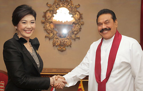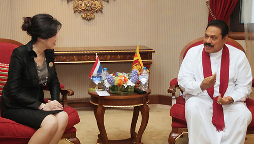 President Rajapaksa has told that Sri Lanka values Pakistan's support and hoped that Pakistani private sector would invest more after the restoration of peace in Sri Lanka. He further noted that Sri Lanka expects Pakistani businessmen to establish manufacturing units in the Pharmaceutical Zone in Kurunegala and invest in the booming tourist industry in the island. An agreement was reached to implement a bilateral programme for the promotion of the cement and sugar industries. During the meeting with Thailand Prime Minister Yingluck Shinawatra, the two leaders discussed with the intention of further strengthening bilateral relations, especially in trade, tourism and investment, as well as regional and multilateral issues. They also discussed the Sri Lanka Thailand Joint Commission meeting planned to be held in Sri Lanka next year. Development of the agricultural and fisheries industries and imparting Thai’s know-how and technology were among the many other topics that surfaced at the talks. In separate meeting on the same day, President Rajapaksa also held bilateral talks with his Iranian counterpart Mahmoud Ahmadinejad on the sidelines of ACD Summit. Iranian President said that the enemies are seeking to create discord and conflict in the region but regional nations should prevent them from doing so through prudence. He said that regional problems should be resolved by regional countries without any foreign intervention. “There is no way for nations to resolve the problems and to build a better and more beautiful world other than cooperation,” Ahmadinejad stated. Commenting on the relations between Iran and Sri Lanka, Iranian leader emphasized the necessity to promote ties in all spheres and said that no power can put obstacle in the way of expanding bilateral relations. President Rajapaksa, for his part, reiterated Sri Lanka's determination for expanding ties with Iran, and called for the removal of obstacles and problems blocking the path of broadened cooperation between the two countries in different fields, specially the energy sector. Ministers and other officials of the respective governments also participated in these meetings. Pix by: Sudath Silva