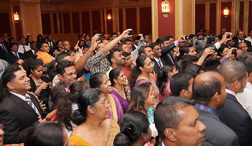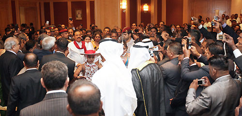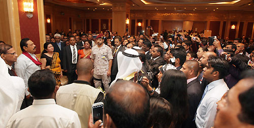 President Rajapaksa further stated that in fact, Middle East workers’ remittances to Sri Lanka are the highest in South Asia with figures doubling in the past 7 years, an estimated migrant population of 1.6 million and an annual outflow of 200,000 Sri Lankan workers. Remittance’s inflows are expected to reach $6 billion, addressing 70 % of the country’s trade deficit. The Sri Lankan government, along with many other Asian emerging economies, has acknowledged the importance of remittances in national development and has thus created several incentives to improve the inflow of money sent by migrant workers into the country. The government created the foreign employment ministry aimed at improving migrant working conditions in foreign countries and dealing with migrant worker affairs. Moreover, the government has introduced incentives to facilitate foreign employment, and has aimed to provide more benefits, the President further added. The colourful ceremony began with a cultural performance from Kandian Dancing troupe, with the lively audience chanting patriotic songs. Amidst cheers of visible joy, President Rajapaksa entered the hall filled with an atmosphere of unmistakable pride. As the President went around the hall to meet the Sri Lankans the cheers grew louder and louder as community members from every corner of Kuwait gathered to the ceremony hall wanted to show their presence and greet the President. Accompanied by members of their family and friends the participants of the meeting thanked President Rajapaksa for the elimination of terrorism and also mentioned that they are happy with the peaceful transition and the new dawn to the nation. They urged him to eradicate the wide spread corruption too. The community also thanked Mr C.A.H.M.Wijeratne, the Ambassador of Sri Lanka for the State of Kuwait and the embassy staff for their hard work towards the success of the President’s tour and arranging the audience with the President. Minister of External Affairs, Prof G.L.Peiris, Minister Susil Premajayantha, Monitoring MP Sajin Vaas Gunawardena, parliamentarian A.H.M.Azwer and the Secretary to the President Lalith Weeratunga were present at the occasion. Pix by: Sudath Silva