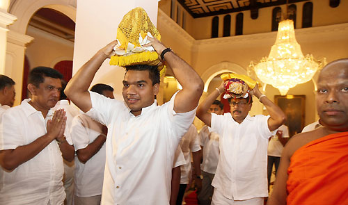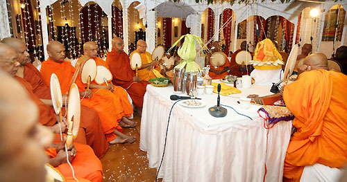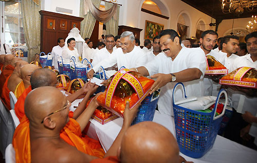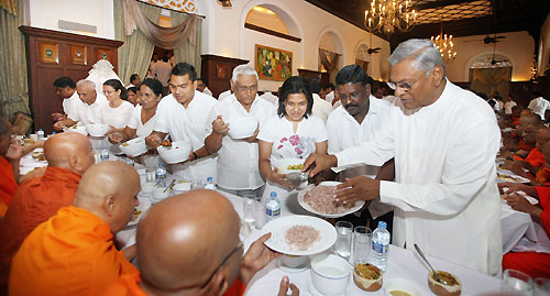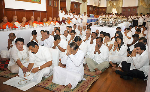 President Mahinda Rajapaksa also celebrated this great day with the all-night pirith ceremony yesterday, on 18 November and sanghika dhana (almsgiving) this morning (19) at the President’s Palace, Colombo. This main religious ceremony was held under the patronage of Parivenadhipathi of Vidyalankara Pirivena and Kelaniya University Chancellor Ven. Dr. Welamitiyawe Kusaladhamma Nayake Thera. Chief prelate of the Sri Lanka Amarapura Chapter Ven Dr Dauldena Gnanissara Maha Nayaka Thero, Ven Dr Kotugoda Dhammawasa Nayaka Thero, Ven Dr Pallattara Sumanajothi Nayaka and large number of Buddhists monks representing all parts of the country have participated the ceremony. Rajapaksa family members including the President himself, First Lady Shiranthi Rajapaksa, their sons, Speaker of the parliament Chamal Rajapaksa MP, ministers, parliamentarians and large number of well wishes joined the religious activities. Meanwhile a special Ashirwadha Bodhi pooja will be held this evening (Sunday 19) at London Buddhist Vihara under the patronage by Sangha Nayaka of the Great Britain and Chief Incumbent of the Temple Ven Bogoda Seelawimala Nayaka Thero. Sri Lanka Freedom Party- UK Branch, Jathika Nidahas Peramuna, other political parties of the UPFA government and few voluntary organisations have organised this religious event to invoke blessing to the President, the country and the people of Sri Lanka. Religious functions of all faiths are being held throughout the country in connection with president's birth anniversary and the anniversary relating to his election to presidency. President Mahinda Rajapaksa, the 5th Executive President of the Democratic Socialist Republic of Sri Lanka, was born in November 18, 1945 and assumed his second term of office on November 19, 2010. He joined active politics in 1968 as he was appointed as the Sri Lanka Freedom Party Organizer in Beliatta, Hambantota District. In the General Election in 1970, he was elected to Parliament as the youngest Parliamentarian at that time. He was the opposition leader during 2002-2004 and appointed as the Prime Minister in 2004. Subsequently he was elected as the President winning the 2005 Presidential election. After defeating the LTTE terrorism and ending 30 years of brutal war, he received a people’s mandate for the second term in 2010. He was re elected at the election on the 26th of January 2010 and was sworn in for a second term in November. Pix by: Chandana Perera