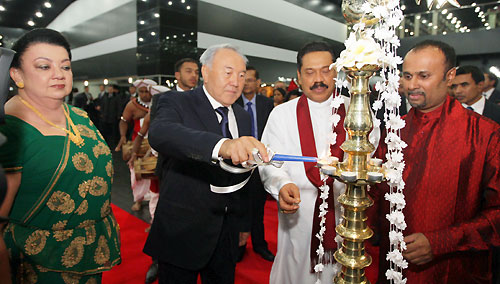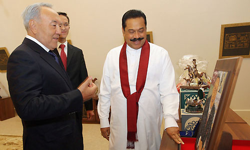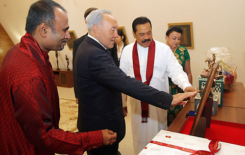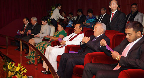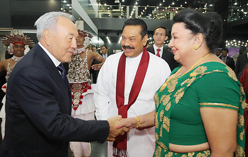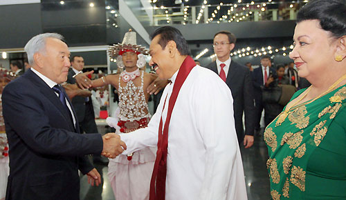 The two leaders discussed on problems of political, commercial and economic cooperation and ways of further improving trade-economic cooperation, scientific-technical, cultural-humanitarian partnership and tourism between the two countries. "Official visit of Sri Lanka's President will create a platform for the open exchange of the views on a wide range of regional and global issues and the basis for further cooperation. Two countries have a good opportunity to get to know each other better and enjoy good relations of confidence and mutual understanding. This meeting will give a new impetus to cooperation between our states in various spheres- economy, politics, and culture “President Nazarbayev said. Kazakhstan President Nazarbayev also assured his Sri Lankan counterpart that his country would stand by Sri Lanka against international pressures and pointed out that Sri Lanka should look for home grown solutions in dealing with its internal problems. He further pledged his country’s wholehearted support towards Sri Lanka’s post conflict development, during discussions. The two leaders also discussed on the possibility of increasing direct flights between the two countries to strengthen the tourism flow in to Sri Lanka and open new avenues for trade and investments. During discussions while Kazakhstan voiced interest in buying Sri Lanka tea, in return Sri Lanka showed interest in purchasing gas and fuel from Kazakhstan. During the meeting the Sri Lankan President extended an invitation to President Nazarbayev to visit Sri Lanka. Celebrating the event a special cultural festival to mark the 20th anniversary of establishing diplomatic relations between Sri Lanka and Kazakhstan was held at the Astana Palace of Peace and Reconciliation at Astana city to coincide with President Rajapaksa’s official visit to Kazakhstan. The Sri Lankan Embassy in Russia also organized a Sri Lankan Culture Day with a dance troupe performance and "Beauties of Sri Lanka” photo exhibition as part of the event at the same venue. President Rajapaksa and President Nazarbayev of Kazakhstan attended the dance concert presented by the Sri Lankan and Kazakhstan artists at the Astana Palace and declared open the photo exhibition in the evening. The "Beauties of Sri Lanka" exhibition is dedicated to the political, social and economic transformation that took place in Sri Lanka after defeating thirty years of terrorism. The expo aiming to promote tourism showcases Sri Lankan culture and beautiful landscapes. President Rajapaksa will also meet the Prime Minister, the Speaker and several senior Ministers of Kazakhstan during his stay. Both countries are set to sign several agreements to further expand bilateral cooperation in the fields of economic, social and cultural relations. Sri Lankan ambassador for Russia Udayanga Weeratunga who is also accredited to the Republic of Kazakhstan coordinated President Rakapaksa’s visit to Kazakhstan. President Rajapaksa was accompanied by First Lady Shiranthi Rajapaksa, External Affairs Minister, Prof G.L. Peiris, Uva Province Chief Minister Sashendra Rajapaksa, Monitoring MP Sajin de Vass Gunawardena and Secretary to the President Lalith Weeratunga. Pix by: Sudath Silva