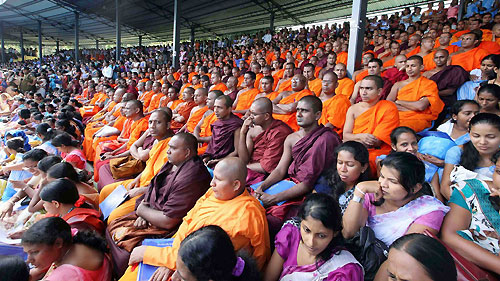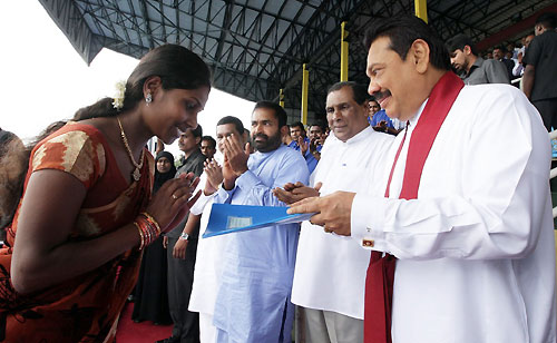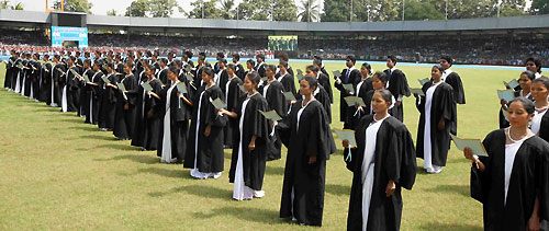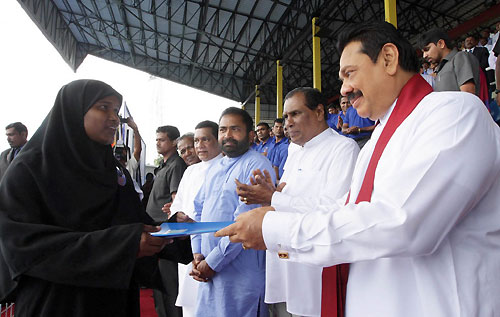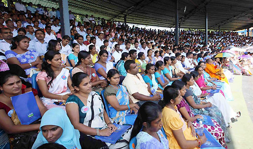 Under this programme all graduates who have completed one year’s training are being provided permanent employment in the government sector. By doing so the government has created a record by granting permanent employment to 50,800 trainee graduates. All the graduates who were recruited under the ‘Development Officer’ constitution will be granted all government benefits including the female graduates who have completed 9 months of training are eligible for 84 days of maternity leave. President Rajapaksa symbolically handed over appointment letters to three Sinhala, Tamil and Muslim graduates at the ceremony. Addressing the graduates the President said that all newly recruited graduates should be committed at the highest and satisfactory level to build a disciplined and developed country. He further stated that in the period of terror under the past governments the graduates and undergraduates had become the main targets. There was a time when university education and the degree certificate guaranteed a death certificate for the youth. Comparatively the graduates face no such problems under this government. Therefore the decision to offer employment to the graduates was taken on behalf of the country. Speaking at the occasion the President said that the government provided Samurdhi benefits to the people despite numerous challenges and it will continuously provide employment to the graduates in the same manner. He said that in developed countries only 2.5% are in the government service. They do not authorise the rate to exceed 3%. In Sri Lanka 12% are in the government service. He said that the government is therefore bearing a huge burden with regard to salaries. Addressing the ceremony, Minister of Public Administration and Home Affairs, W.D.J. Seneviratne said that the graduates not to be duped by false propaganda as they will be granted permanent employment after the training period of one year. He further emphasised that the government will not hesitate to grant permanent employment for graduates. The minister said that no difference, with regard to political party, community, area, caste or creed has been made when making the appointments as only their degree qualification was considered coving all 25 administrative districts. The Sri Lanka Freedom Association of Graduates also presented a felicitation award to the President. Appreciating the move the newly appointed graduates said that none of the governments have treated the young graduates in this manner. They said that they appreciate the benefits extended by the government and it is of immense benefit to the unemployed graduates. After the ceremony, President Rajapaksa walked to the graduates and waved at them. Ministers Maithripala Sirisena, Dullas Alahapperuma and Ranjith Siyambalapitiya were amongst those who participated in the occasion. Venerable Maha Sangha, other religious leaders, many Parliamentarians, local politicians, government officials, parents and a large crowd were present Pix by: Sudath Silva