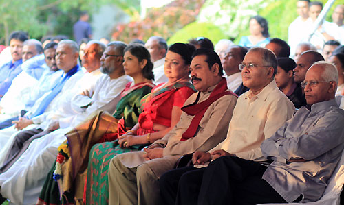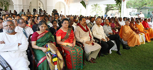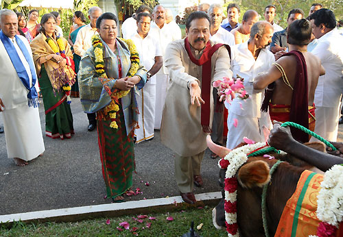 The President and First Lady were garlanded and warmly received in traditional manner on arrival to the celebrations. The Pongal was made in new pots and pans rested on a new hearth. Rice, Dhal, Sugar were added to the pot filled with milk and Pongal was cooked in it. Mrs Rajapaksa followed the Hindu tradition by putting a handful of new rice into the pot. The Pongal was made in front of the statues of God Vinayager, and the God Suriyabaghawan and sweet meat, fruits, coconut, betel, aricanuts, and sugar cane were placed before the statues of God. After making blessings for the President, the people of the country and for the prosperity of the country, the Prasadam were distributed to all participants. The President also participated in Hindu religious activities, the highlight of the celebration Komatha Pooja and also offered food to farm animals. The function made colourful and melodious by cultural events and Nadaswaram music. Indian High Commissioner in Sri Lanka Ashok K. Kantha, External Affairs Minister Prof.G.L.Peiris, Eelam People's Democratic Party leader and Traditional Industries and Small Enterprise Development Minister Douglas Devananda, Buddha Sasana and Religious Affairs Deputy Minister M.K.D.S. Gunawardena and President’s Secretary Lalith Weeratunga were also present. A large number of Hindu devotees also participated at this function. Pictures are seen here President Mahinda Rajapaksa, First Lady Shiranthi Rajapaksa and Indian High Commissioner Ashok K. Kantha participating in Thai Pongal observances and religious dignitaries and distinguished guests enjoying the cultural show. Pix by: Sudath Silva