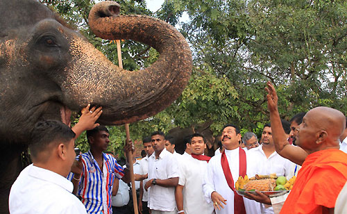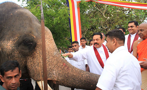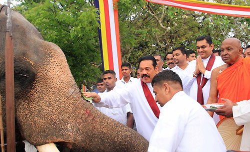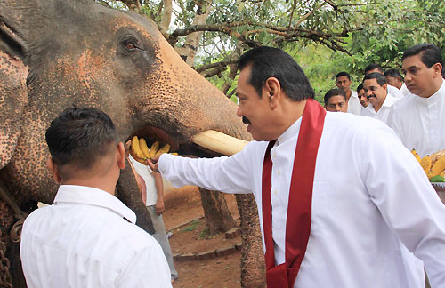 Venerable Dr Soratha Nayaka Thero performed the rituals by anointing oil on the President’s head and blessed him. As instructed by the Ministry of Indigenous Medicine, Department of Ayurveda, Sinhala New Year Auspicious Times Committee and astrologers, oil anointing was performed by facing the East and standing on imbul leaves under a canopy of wood apple leaves and attired in white colour. Oil was anointed with a mixture of wood apple leaves. Thereafter those present at the Kirivehera participated in the anointing of oil and fulfilling the traditions. Ministers Salinda Dissanayake and Jagath Pushpakumara, Deputy Minister Pandu Bandaranayake, Uva Governor Nanda Mathew, Chief Minister Shashindra Rajapaksa, Namal Rajapaksa MP and many local politicians participated in this function. The Nayaka Thero said that the anointing of oil for the New Year is one of the main traditions specialised to Sri Lankans. The prelate said that the meaning of this oil anointing tradition is actually wishing a healthy life for next year. He said that it could also be mentioned as a tradition linked to the natural environment. Addressing the ceremony, President Rajapaksa said that oil anointing ritual has being performed since ancient time with the objective of giving mental strength for building the nation. He said that this is also a good opportunity to get a consolation. Several invited guests and officials were amongst a large number of people who were present at the ceremony. Meanwhile many functions were organized countrywide to mark the anointing of oil for the New Year. Ministry of Indigenous Medicine announced all traditional herbals and creams required for the Oil Anointing ritual have been distributed among 10,000 Buddhist temples and 15,000 registered Indigenous Physicians Island wide at present. Public are requested to get them from the nearest temple or the Ayurveda doctor in their areas. In parallel to the National oil anointing ceremony, large crowd was present at the Natha Devala premises of the Sri Dalada Maligawa to perform the annual oil anointing ritual. Resident monks of the Asgiriya and Malwatta Chapters anointed devotees with oil and also anointed oil on the heads of the tuskers of Sri Dalada Maligawa. Devotees visited the Bellanwila Raja Maha Viharaya temple this morning for the oil anointing ceremony. The oil anointing tradition of the indigenous community took place at the Kotabakiniya village in Mahiyangana. The function was organized under the patronage of the Veddah Chief Uruvarige Wannila-eththo. It’s only this oil anointing tradition that the indigenous community engages in New Year. The ceremony of oil anointing was held for over 100 elephants at the Pinnawala orphanage. All elephants and calves in the orphanage were treated with fruits and special leafy diet. Another oil anointing ceremony took place at the Dehiwela National Zoo. While herbal oil was first anointed on the elephants, the other animals were also anointed with oil thereafter. Pix By : Nalin Hewapathirana