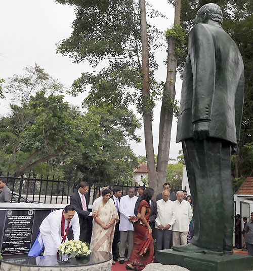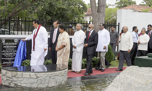 President Mahinda Rajapaksa unveiled a statue of the late statesman and veteran politician Lakshman Kadirgamar on his 8th Death Anniversary today (August 12) at the Lakshman Kadirgamar Institute of International Relations and Strategic Studies (LKIIRSS) in Horton Place, Colombo-07. Thereafter Ministers, parliamentarians and the distinguished guests headed by the President offered floral tributes to the statue. A special commemoration ceremony was held at the premises of the institute to mark the occasion under the patronage of President Rajapaksa.