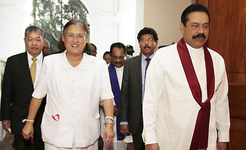 Thai Princess Maha Chakri Sirindhorn and Japanese Princess Tsuguko of Takamado arrived in Sri Lanka Monday on a four-day official visit at the invitation of Sri Lankan President Mahinda Rajapaksa. The visiting princesses of Japan and Thailand paid homage to Sri Dalada Maligawa (Temple of the Tooth Relic) in Kandy earlier this afternoon. They were warmly welcomed by the Chief Custodian of the Maligawa (Diyawadana Nilame) Nilanga Dela. The two Royals will have the opportunity to attend the final Randoli Perahera tonight on Nikini Full Moon Poya Day. President Rajapaksa and First Lady Shiranthi Rajapaksa also hosted a banquet this evening in honour of Princess Maha Chakri Sirindhorn of Thailand. The Thai delegation included the Ambassador of Royal Thai Embassy in Sri Lanka, Mr. Poldej Worachat. Japanese Ambassador in Sri Lanka Mr. Nobuhito Hobo, Governor of Central Province Tikiri Kobbekaduwa, Minister of External Affairs Prof G.L.Peiris, Chief-of-Staff to the President Gamini Senerath, Several other government ministers, parliamentarians and dignitaries were present at these occasions. Pix By: Sudath Silva