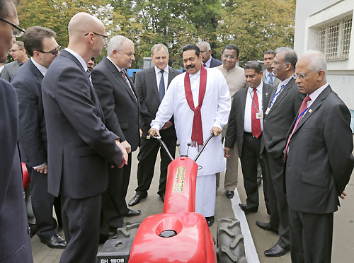 During the bilateral discussions President Rajapaksa had with both the Belarusian President and the Prime Minister, it was formally agreed to set up assembly plants for buses and tractors by Belarusian investors in Sri Lanka as joint ventures. It was confirmed by the Belarusian investors and business leaders at the Belarus- Sri Lanka Business Forum which was organised to identify potential areas for collaboration in order to further develop economic and trade cooperation between the two countries at the National Library Auditorium in Minsk, the capital city of Belarus. On arrival to the Minsk Automobile Plant President Rajapaksa and his entourage were received by the company management. Vladimir Volchok, the Director General, and Mr. Vitaly Goncharik, the Deputy Director General of the plant joined with the President and described the manufacturing process during the inspection tour. President Rajapaksa, with his delegation, also visited the Minsk Tractor Works where a variety of tractors and other agricultural and industrial machineries are being manufactured. President Rajapaksa took special interest and closely inspected hand tractors and agricultural machineries used in agricultural sector. Pictures are seen here President Rajapaksa inspecting a heavy vehicle assembling line at the automobile plant, a heavy truck being manufactured and closely inspecting a tractor and another hand tractor on display. At the Minsk Automobile Plant, President Rajapaksa, together with External Affairs Minister Prof. G.L.Peiris, Secretary to the President Lalith Weeratunga, Provincial Councilors and other members of the delegation inspected a high-quality passenger bus on display. Vladimir Volchok, Director General and Vitaly Goncharik, Deputy Director General of the plant are also in the pictures. Pix By: Sudath Silva