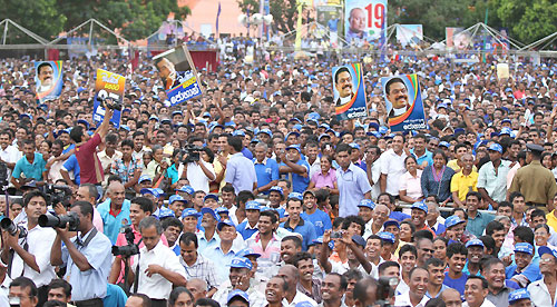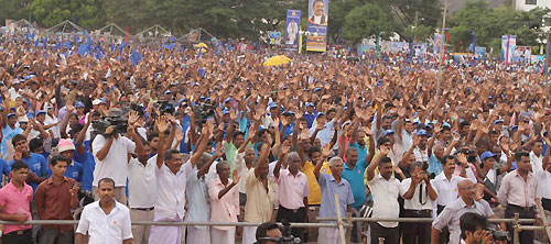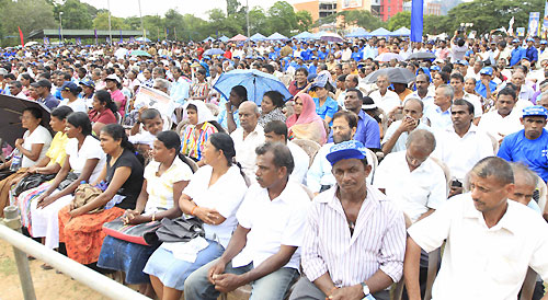 Massive crowds descended on the Maligapitiya grounds in Kurunegala from all four corners of the country and the entire Kurunegala transformed into blue as the crowds began approaching the ground in processions led by ministers, parliamentarians and Provincial Council election candidates. The General Secretary of the SLFP Minister Maithripala Sirisena said the SLFP has passed 62 years of excellence by protecting integrity and independency constantly. The party has rendered several revolutionary services such as strengthening local economy and production process, developing free health service and welfare of the working community. After 1956 election victory, the Golden Era of the Sri Lanka Freedom Party is the current period under the leadership of President Rajapaksa. He further added that under the leadership of the President the country was able to eliminate the brutal terrorism, ending the three decades of war and since then there is no person in the country capable of challenging his leadership. The minister further noted that the present government has carried out huge development activities for the benefit of not only the current generation but also for the benefit of children who are to be born in the future. Addressing the 62nd anniversary, President Rajapaksa said that the government will not bow down to any foreign forces or to local conspirators. The President also requested every citizen of the country to join with the government to safeguard the democracy in the country. He further said the Kurunegala district has a special significance to the SLFP as it was in this district that the first conference of the party was conducted. The President has also pointed out that the SLFP has been able to walk along with the leftist forces of the country and to appreciate such parties. He also explained how the SLFP was committed to build a local economy by nationalising the harbour, lands and transportation services. The President said, a dictator is a ruler who does not conduct polls and works according to his own agendas but this government has restored democracy and taken steps to hold elections. Therefore, no one can accuse this government of being a dictatorship. He said it is not his problem of having a weaker Opposition and a poor leadership against the government. It is also no secret that therefore certain powerful foreign and local elements are trying to create divisions between the communities and religions to bring anti government groups to power and bring this country under their heel. They should realise that this government has the blessings of the masses who love this country and its culture and values who therefore would never allow them to succeed, said President Mahinda Rajapaksa. Addressing the 62nd annual convention the President further emphasised that the government treated all religions alike but that Buddhism had been provided with Constitutional safeguards and the government could not do anything about that. Senior Minister S.B. Navinna delivered the welcome speech and Senior Minister A.H.M. Fowzie, Ministers Patali Champika Ranawaka, Dinesh Gunawardena and Vasudeva Nanayakkara also addressed the gathering. SLFP General Secretary and Minister Maithripala Sirisena and many Party representatives also joined in the anniversary commemoration.