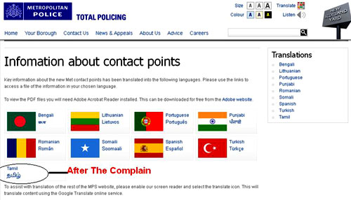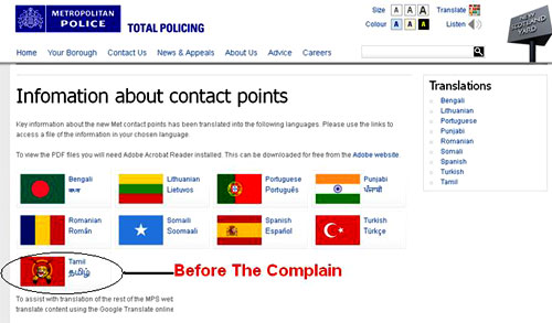The Metropolitan Police of London were embarrassed today (11 September) by mistakenly publishing Tamil Tiger flag in its web site in section under ‘Information about contact points’ (http://www.met.police.uk/contact_points/). This particular web page contains the key information about the new Met contact points translated into few languages such as Bengali (Bangladesh), Lithuanian, Portuguese (Portugal), Punjabi (India), Romanian, Somali, Spanish (Spain), Turkish (Turkey) and Tamil. To highlight those languages the Met Police web has used respective country flags but for Tamil language they have used the Tamil Tiger flag. After lodging a complaint by the President of British Sri Lankan Forum about this grave mistake done by the Met Police, the relevant authority has taken prompt actions to remove the flag from its web site, but no explanation has been given yet.