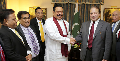 President Mahinda Rajapaksa met Pakistani Prime Minister Nawaz Sharif in New York City on the margins of the United Nations General Assembly on September 25. This is the first occasion both leaders met each other since Pakistani new leader Nawaz Sharif was elected for the third time as the Prime Minister at the General Election which was held in last June. The discussion between President Rajapaksa and Prime Minister Sharif centered on the different ways Sri Lanka and Pakistan could further strengthen bilateral relations, particularly in the area of economic cooperation and security based on longstanding friendship.