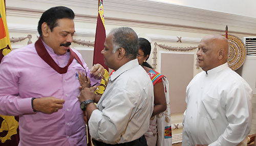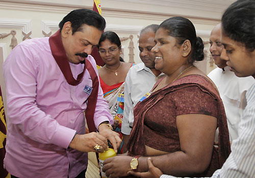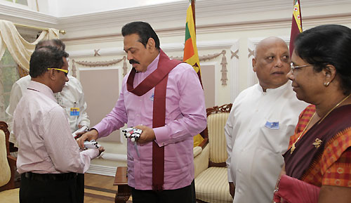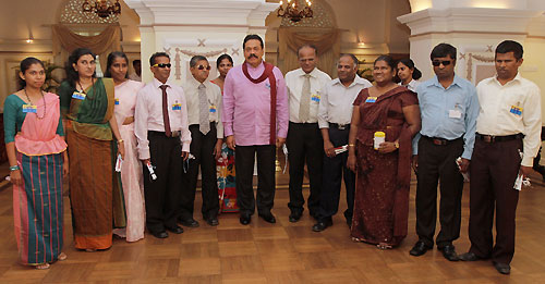 The aim of selling flags is to raise funds for the welfare of visually impaired students. The first flag was pinned on the President by the chairman of the association Sugath Wasantha De Silva. A symbolic presentation of white canes also took place today to mark International White Cane Day. The President had a cordial discussion with members of the Sri Lanka Council of Visually Impaired Graduates’ and posed for a group photograph. Minister of Social Services Felix Perera, Secretary to the Ministry Emelda Sukumar, Secretary of the Visually Impaired Graduates’ Association P.D.Nihal and Treasure Padma Kumari Karunathilaka were present at the occasion. Pix by Nalin Hewapathirana