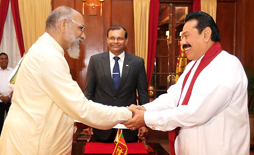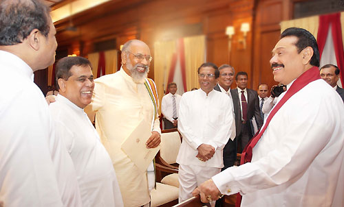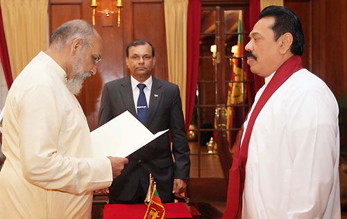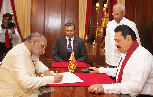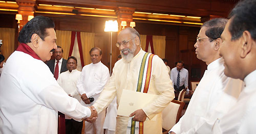 Newly elected Chief Minister of the Northern Province C.V.Vigneshwaran was sworn in once again for more ministerial portfolios of the provincial council this morning (17 Oct) at the Presidential Secretariat. The Chief Minister took oaths before President Mahinda Rajapaksa. This is the first time in history that a chief minister took oaths twice in a week. Earlier Wigneswaran was sworn in as the Northern Provincial Council Chief Minister on the 11th of October.