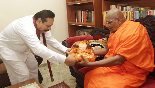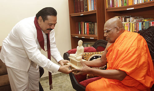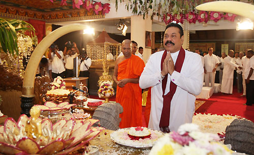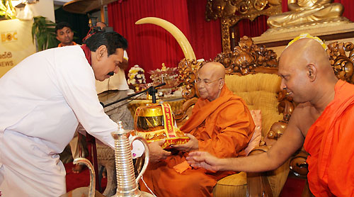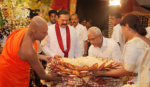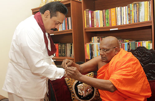 The Ashirvada Pooja was also held to invoke blessings on all Sri Lankans including the government led by President Mahinda Rajapaksa who participated in the religious observance. The event was organised by the Chief Incumbent of the Sri Sambodhi Viharaya Venerable Daranagama Kusaladhamma Nayaka Thera. Members of the Maha Sanga headed by Most Ven. Kotugoda Dhammavasa Anunayake Thera chanted Seth Pirith and invoked blessings on the President and the country. The latest issue of the journal published by Sambodhi Vihara and indigenous variety of rice grown without using chemical fertilizer were presented to the President. Members of the Dayaka Sabhawa also presented the scroll related to the launch of the Buddhist news bulletin in ‘The Buddhist Channel’ which was launched under the guidance of the President. Meanwhile President Rajapaksa visited Sri Dharma Vijayaloka Viharaya in Rukmale, Pannipitiya and called on the acting Chief of the Kotte Sri Kalyani Samagri Dhamma Maha Sangha Sabha Most Venerable Dr. Ittapane Dhammalonkara Nayaka Thera. The President visited Sri Dharma Vijayaloka Viharaya to look into the well being of the Nayaka thero and wished him good health and long life. The President also extended his greetings and birthday felicitations to the Nayaka thero whose birthday fell recently. The President also had a brief discussion with the Thera. Maha Sangha led by the Chief Incumbent of the Narahenpita Sri Abhayarama temple Ven. Muruttettuwe Ananda Thera were also present. Pix by: Chandana Perera & Nalin Hewapathirana