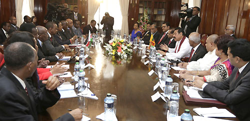 The Sri Lankan delegation, headed by President Mahinda Rajapaksa, held bilateral talks with its Kenyan counterpart, headed by President Uhuru Kenyatta at the State House in Nairobi on 14 December. Earlier Kenyan President Kenyatta warmly received President Rajapaksa upon arrival at the State House for bilateral talks. The two leaders shook hands warmly in a physical and symbolic gesture of friendship between the two nations. Kenyan President gave Sri Lankan President a warm welcome before reviewing a guard of honour.