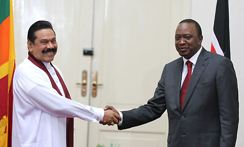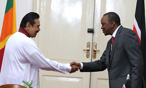 After a guard of honour President Kenyatta introduced the cabinet members to his Sri Lankan counterpart, who also introduced his entourage to President Kenyatta. Later the two Presidents went into talks to further strengthen political, economic and international ties between the two countries. The two leaders signed 8 MOUs at the State House. The aim of these MOUs is to promote relations in bilateral trade, international and cultural affairs. Several MOUs were also signed in connection with widening the investment opportunities, cooperation in Sports, free visa facilities to Kenya for diplomats in both countries. The MOUs also cover economic, commercial, technological cooperation, bilateral advisory benefits and to set up joint commissions between the two countries. Adopting a double taxation policy was also considered during the talks. The two countries entered into agreements in the future on oceanic conservation. A programme will also be launched for the development of cricket and athletics. Sri Lanka will send cricket coaches to Kenya and receive trainers from Kenya for athletics. The two leaders also discussed on starting direct flights between the two countries for the development of tourism. It has also been agreed upon to set up a Kenyan High Commission in Sri Lanka. Meanwhile the Kenyan President hosted a special banquet in honour of the Sri Lankan President and the First Lady. President Rajapaksa who is on a four day official visit to Kenya also participated as a special guest at the 50th Independence Day ceremony of Kenya last Thursday at the Moi International Sports Complex in Kasarani on the outskirts of the Capital City, Nairobi. Minister Prof. G.L. Peiris, Deputy Minister Geethanjana Gunawardena, Parliamentarian Sajin Vas Gunawardena, Chief Minister of the Uva Province Shashendra Rajapaksa, Secretary to the President Lalith Weeratunge, Additional Secretary to the Ministry of External Affairs Mrs Kshenuka Seneviratne and Sri Lanka High Commissioner for Kenya, T. Raveenthiran who is also accredited to Ethiopia, Tanzania, Uganda, UNEP and UN-HABITAT, Rwanda, Mali and South Sudan were also present. Pix by: Sudath Silva