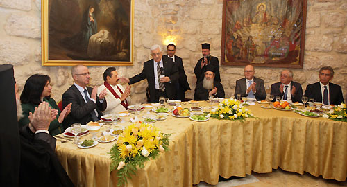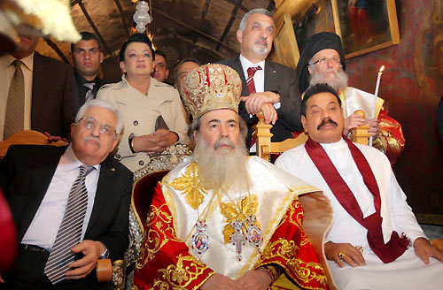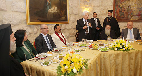 The Patriarch of Jerusalem Theophilos III of the Church of the Nativity in Bethlehem, hosted Sri Lankan President Mahinda Rajapaksa, First Lady Shiranthi Rajapaksa, Palestinian President Dr. Mahmoud Abbas and Prime Minister Rami Hamdallah for dinner on Monday evening (06 January). Many local and foreign dignitaries were present at the dinner hosted by the Patriarch of Jerusalem Theophilos III.