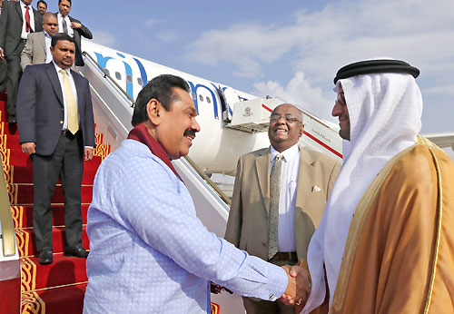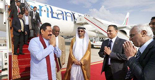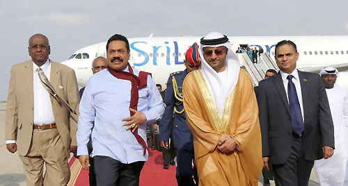 The President who left the island today (20 January) on a one-day official visit for UAE reached Abu Dhabi, the capital City of the Arabian nation. Chairman of Department of Municipal Council Affairs Majid Ali Al Mansouri and Sri Lankan Ambassador in the UAE Dr. Mahinda Balasuriya warmly welcomed the President at the Abu Dhabi International airport. President Rajapaksa is scheduled to take part in the World Future Energy Summit and the Zayed Future Energy Awards Ceremony this evening. In addition the President will also hold bilateral discussions with top government officials of UAE and meet with the Sri Lankan community living in the Emirate. According to the Prize website, the annual award celebrates achievements that reflect impact, innovation, long-term vision and leadership in renewable energy and sustainability. Among the finalists for this year’s award include multinational companies such as General Electric and Wal-Mart, among others. Minister of External Affairs Prof. G.L. Peiris and Monitoring MP of the Ministry of External Affairs Sajin Vass Gunawardena are a part of the Sri Lankan delegation. Photos By: Sudath Silva