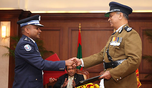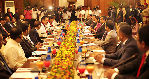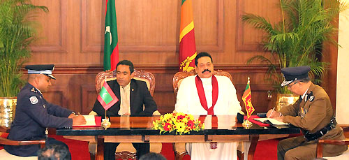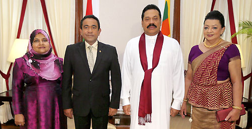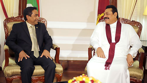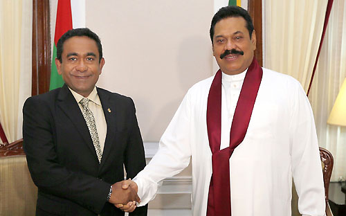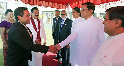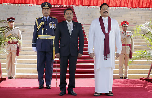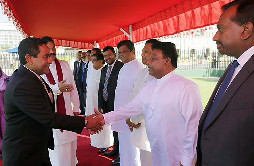 After a cordial discussion between the two leaders, the delegations of the two countries commenced bilateral discussions covering several spheres. President Rajapaksa expressed his appreciation over the victory achieved by the Maldivian leader in the Presidential elections held in November last year and the peaceful political transformation that took place in the neighboring country. "I am confident that under your able guidance, the Maldivian people would prosper and the country would reach its full economic potential," President Rajapaksa said. "As the only two island nations in South Asia, we share many values and cultural traditions." The President further added that visits between officials at the highest political levels serve to further strengthen the "bonds of friendship between our two countries." Speaking about the historical ties between Sri Lanka and Maldives, President Yameen pointed out that almost every Maldivian feels, Sri Lanka is often like a second home. Currently, there are more than 9,000 Maldivians living in Sri Lanka. "Sri Lanka has always been a brother and ally," President Yameen said. "We are very grateful for the invaluable friendship." President Rajapaksa thanked Maldives for its continuous support to Sri Lanka at international fora to which President Yameen quickly replied, "What are neighbors for, if we can't support each other in times of need. We will support you." Citing economic development, and the peace and stability currently prevailing in Sri Lanka, Maldivian President noted, "We marvel the remarkable achievement the Sri Lankan people are enjoying. What is good in Maldives will transfer to Sri Lanka. Peace and prosperity in Sri Lanka will benefit Maldives." The two leaders discussed at length in several fields including the fisheries industry, higher education, health, immigration, air services, sports, food security, defence, tourism and trade relations. Three agreements were signed after the bilateral talks. Minister of Youth Affairs and Skills Development, Dullas Alahapperuma and the Maldivian Foreign Minister Dunya Maumoon inked a Memorandum of Understanding (MoU) on Vocational Training and Youth Development. The MoU on Bilateral Corporation in the Field of Sports was signed by Minister Mahindananda Aluthgamage and the Minister of the Maldivian President’s Office Mohamed Hussein Shariff. Inspector General of Police N.K. Ilangakoon and the Maldivian Police Commissioner Husaid Waheed signed the MoU on Combating Transnational Crime. After the talks and the signing of the agreements, the Maldivian President signed the guest book at the Presidential Secretariat. Senior Minister Urban Affairs A.H.M. Fowzie, Minister of External Affairs Prof. G.L. Peiris, Minister of Economic Development Basil Rajapaksa, Minister of Health Mr. Maithripala Sirisena, Minister of Youth Affairs and Skills Development Dullas Alahapperuma, Minister of Industry and Commerce Rishad Bathiudeen, Minister of Fisheries and Aquatic Resource Development Dr. Rajitha Senarathne, Minister of Education Bandula Gunawardena, Minister of Sports Mahindananda Aluthgamage and Many Parliamentarians were present on the occasion. High Commissioner of Sri Lanka in the Maldives Sarathchandra Dela, Maldivian High Commissioner for Sri Lanka Hussain Shihab, Chief of Staff of the President Gamini Senarath, newly appointed Secretary to the Ministry of External Affairs, Mrs Kshenuka Seneviratne and a number of other secretaries of ministries and government officials were also present at the bilateral talks. The Maldivian High Commission said that many important meetings with the Sri Lankan government officials and other sectors have also been arranged for the Maldivian President to participate including the Sri Lanka Maldivian Business Council meeting which businessmen from both countries will attend. The Maldivian President and his entourage arrived in Sri Lanka yesterday (21 Jan). Photos by: Sudath Silva