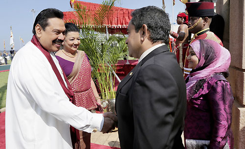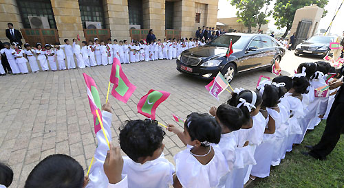 The newly elected Maldivian President Abdulla Yameen Abdul Gayoom who is in Sri Lanka on a three-day official visit, met President Mahinda Rajapaksa at the Presidential Secretariat in Colombo this morning on January 22. The Maldivian President visited Sri Lanka for the first time after his election victory as the president on an invitation made by President Rajapaksa. Young Sri Lankan children welcomed Maldivian President on arrival for bilateral talks with President Rajapaksa. Sri Lankan President accorded a warm welcome to his Maldivian counterpart and the First Lady Fathimath Ibrahim at the Presidential Secretariat. A special Military Guard of Honour was held in honour of President Yameen. First Lady Shiranthi Rajapaksa also joined in the welcoming ceremony.