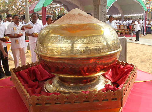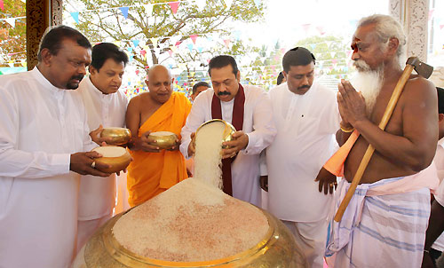 The National New Rice Festival (Aluth Sahal Mangalyaya) - 2014 was held near the historic Jaya Sri Maha Bodhi in Anuradhapura under the patronage of President Mahinda Rajapaksa. The New Rice Festival or the ‘Aluth Sahal Mangalyaya’ is considered as thousands of years old ancient tradition which was launched with the arrival of the Jaya Sri Maha Bodhi to the island. It is an important annual ritual of the harvest festival in Sri Lanka. The first batch of new rice after being plucked, threshed and winnowed is offered to the Buddha and deities. The festival of offering the new rice harvest obtained from the cultivation season to secure blessings of the Jaya Sri Maha Bodhi to meet many of the objectives including the receipt of rains at the appropriate time, to maintain the cultivation season successful and to achieve self-sufficiency in rice.