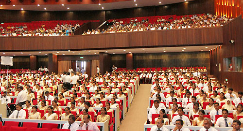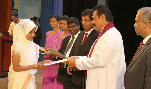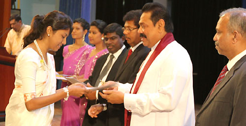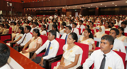 Addressing the ceremony, the president pointed out those small scale entrepreneurs discharged a significant service when a country was developing speedily. Therefore he referred to the importance of state banks directing more attention on encouraging small entrepreneurs. They suffer setbacks as they lack of management. It is the obligation of the bank to handle them. He further pointed out that investigation will be conducted regarding the business collapses of small entrepreneurs due to various reasons and to reactivate them. The president said that businessmen who fail to repay their debt should be looked into and relief granted if necessary. Further expressing his views the President said that customers are more important. They should be well treated. He requested the new recruits to provide an efficient service to the customers. 400 Banking Assistants representing the Western and Southern Provinces received appointment letters at today’s ceremony. 1000 Banking Assistants have been recruited to the People’s Bank. Last February 600 of them received their letters of appointment at a different ceremony which was held under the patronage of President Rajapaksa. The handing over of appointment letters to the rest was postponed due to Western and Southern Provincial polls. They received their letters of appointment today. Deputy Finance Minister Dr. Sarath Amunugama and the Chief of Presidential Staff and Chairman of the People's Bank Gamini Sedara Senarath also addressed at this occasion. People’s Bank; Members of the Board of Directors, Chief Executive Officer / General Manager, N Vasantha Kumar together with the Corporate & Executive Management, representatives from trade unions and voluntary associations, bank officials as well as the family members of the appointees were also present. Pix by: Nishanka De Silva