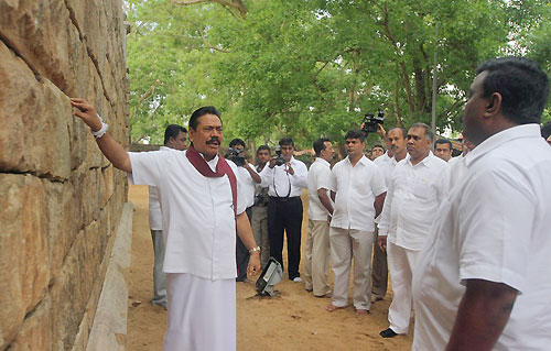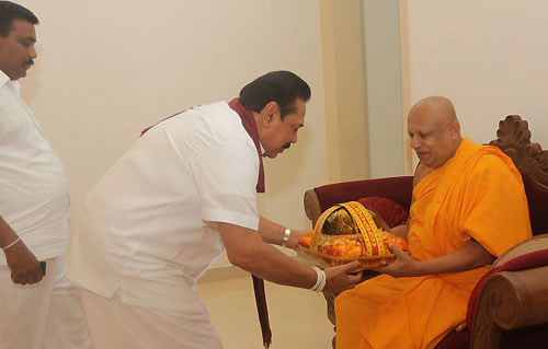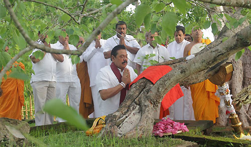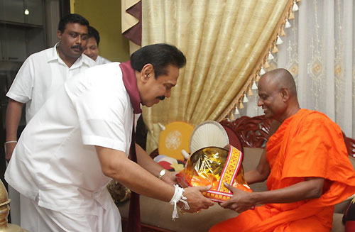 President Mahinda Rajapaksa participated in several religious observances and paid homage to the Jaya Sri Maha Bodhiya in Anuradhapura this morning (08 April). Later, the President called on the Chief Incumbent of the Atamasthanaya Venerable Pallegama Siriniwasa Nayake Thera and received his blessings after a brief discussion. The President also inspected the ongoing construction work within the Jaya Sri Maha Bodhi sacred site. Thereafter President Rajapaksa attended religious rituals held in the Ruwanweli Seya and secured the blessings of the Triple Gem. He joined in the Pinkama of ordaining 75 novice monks entered the Buddhasasana at the same day and offered Pirikara to those monks. The president also paid a courtesy call on the Chief Incumbent of the Ruwanweli Seya Venerable Pallegama Hemarathana Nayaka Thero and secured his blessings. The President also seized the opportunity of exchanging pleasantries with devotees who were at the Ruwanweli Seya. Later President Rajapaksa participated in several other public ceremonies in the Anuradhapura area. North Central Governor Karunaratne Divulgane, Chief Minister S.M. Ranjith and Deputy Minister W.B. Ekanayake were among those present on the occasion. Pix by : Nishanka de Silva