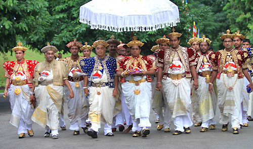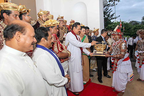 Diyawadana Nilame Pradeep Nilanga Dela handed over the Sannasa this afternoon (11 August) to President Mahinda Rajapaksa informing the successful completion of the Kandy Sri Dalada Esala Perahera-2014 at the President’s House, Kandy. The final Randoli Perahera of the annual Esala Perahera Festival that centres the Dalada Maligawa paraded the streets magnificently last night on Nikini Full Moon Poya Day. The Perahera concluded today morning with the water cutting Day Perahera parading on the streets.