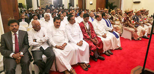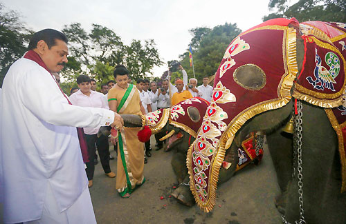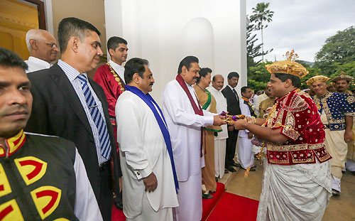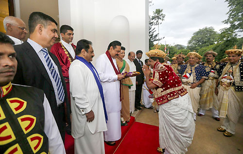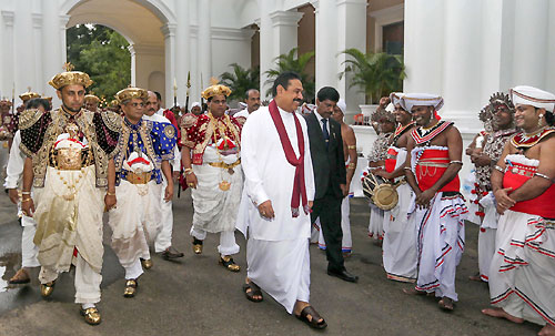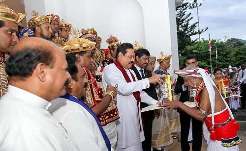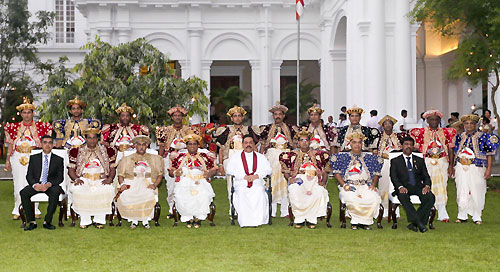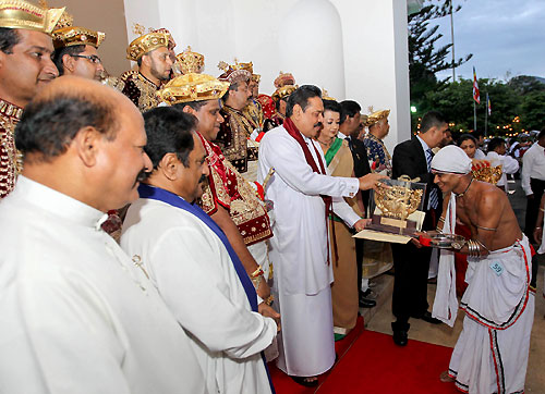 According to the traditional customs, Diyawadana Nilame (Chief Custodian) of the Sri Dalada Maligawa (Temple of the Tooth Relic) accompanied by the Basnayaka Nilames of the main four Devalayas reported the successful completion of the annual Esala Maha Perahera of the Maligawa and the four Devalayas. The Sannasa- Perahera Report (Scroll of Memorandum) formally announces to the President that the Annual Esala Perahera was held successfully in keeping with the age old traditions. The President thereafter handed over the Sannas Pathraya to the secretary to the President Lalith Weeratunga entered the shrine room with the Nilames and made offerings to the Lord Buddha. A traditional ceremony was held under the patronage of the President to present awards and certificates of appreciation to artistes who participated in the Perahera. Speaking at the ceremony, President Rajapaksa extended his profound thanks on behalf of the Government and the people of Sri Lanka, to all those who were involved in the conduct of the Dalada Perahera in such grandeur and its successful conclusion. The President noted that the Esala Perahera began during the time of King Sri Kithsirimewan in the 10th Century AD to honor the Sacred Tooth Relic of Lord Buddha as Sri Lanka's main cultural event and thanked Diyawadana Nilame Pradeep Nilanga Dela and the Basnayake Nilames of the Devala's for conducting the Perahera in accordance with the unique traditions. The President also said that his Government which has realised the responsibility of protecting and nurturing the Buddha Sasana in the country will continue to help develop Buddhist Vihara's and other Buddhist shrines for the development and sustenance of Buddha Sasana. The President also presented certificates to the artistes who performed in the Perahera. The once in a lifetime Presidential award and cash prizes were presented to few selected artistes while many outstanding artistes and dance troupes were also presented certificates and cash prizes. Merit certificates were presented to artistes and all other special artistes were felicitated. The President also posed for a group picture with the Basnayake Nilames. The President and the First Lady thereafter gave food to two baby elephants, Mihin Raja and Abhaya Raja which are belongs to the Dalada Maligawa. First Lady Shiranthi Rajapaksa, Governor of the Central Province Tikiri Kobbekaduwa, Chief Minister of the Central Province Sarath Ekanayake, Kandy Mayour Mahendra Ratwatte, Secretary to the President, Lalith Weeratunga, District Secretary of Kandy Gamini Seneviratne and many distinguish invitees were present at the ceremony. Pix by: Sudath Silva