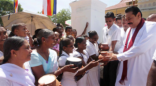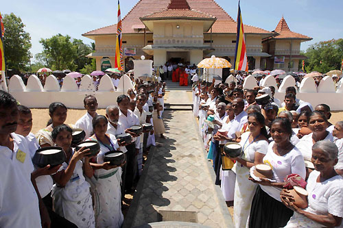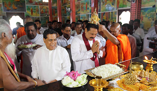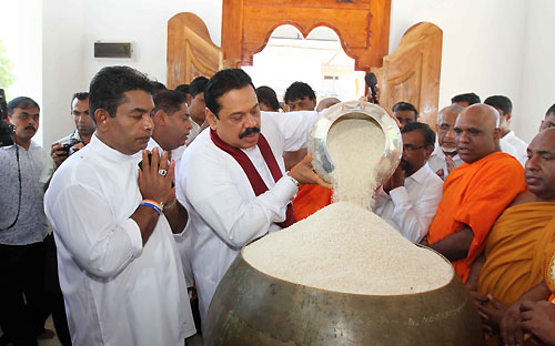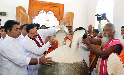The Agasas Maha Mangalyaya, the offering of the prominent portion of the new harvest to the Buddha and deities has taken place at the Dharmodaya Piriven Viaharaya this morning (10) in Girandurukotte under the patronage of President Mahinda Rajapaksa. It was done by Mahaweli 'C' division farmers in the area. They offered their new rice harvest of the Yala season amidst religious observances. The festival is an integral part of the harvest season in Sri Lanka and an annual ritual carried out for centuries.