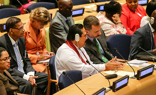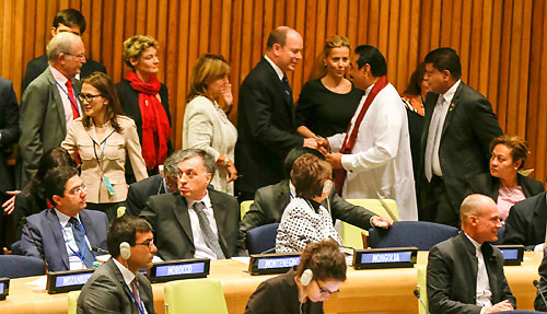 UN Secretary General directed a missive to President Rajapaksa in last February, inviting the Sri Lankan leader to attend the event. Approximately 120 heads of state and government were reported to be in attendance at the Summit, which is considered to be the largest gathering of world leaders in the history of climate change talks. Leaders from all sectors – government, business, finance and civil society were also invited for the UN Climate Summit to make bold commitments to action in eight identified critical areas: Agriculture, cities, energy, financing, forests, industry, resilience and transportation. Addressing the Climate Summit, President Rajapaksa said the UN framework convention on climate change is the primary inter governmental forum for addressing the global response. The world should focus serious attention on health of the global environment today. The danger forced by climate change is current emergency. The principals of equity and common but differentiate responsibilities and respective capabilities must guide the world in search for solutions. This challenge is universal and must be addressed collectively and multi dimensionally. The clean development mechanisms to reduce green house gas emission are imperative. Developed countries must implement their commitment to the developing countries by providing financial and technical support. All parties to the convention must expedite domestic preparations although Sri Lanka was able to triple its per capita income within the last eight years its per capita carbon emission is still less than one metric ton. According to disciples of Buddha the earth and its vegetation do not belong to rulers. They are only temporary trustees who have to protect the environment for the benefit of future generation. The President further said that Sri Lanka ratified UN climate change convention in 1993 and acceded to Kyoto protocol in 2002 and added that the present government has given priority to address climate change and other related problems under the Mahinda Chinthana policy. President Rajapaksa is seen having a casual conversation with Prince Albert II, Head of State of the Principality of Monaco and the Prime Minister of Spain Mariano Rajoy, during the United Nations Climate Summit 2104 at the UNHQ in New York. Full text of the speech: Excellencies, The health of the global environment is today in need of serious attention. The danger posed by climate change is a current emergency. Our challenge is universal and must be addressed collectively and multi-dimensionally. The UN Framework Convention on Climate Change (UNFCCC) is the primary inter-governmental forum for addressing the global response. The principles of equity and common but differentiated responsibilities and respective capabilities must guide our search for solutions. The Clean Development Mechanism to reduce GHG emissions is imperative. Developed countries must implement their commitments to the developing by providing financial support, technology development and transfer, and capacity building. All parties to the Convention must expedite domestic preparations for intended nationally determined contributions. Sri Lanka ratified the UNFCCC in 1993 and acceded to the Kyoto Protocol in 2002. Sri Lanka’s leaders have been drawing inspiration from the philosophy of Gautma Buddha, preached by Arahat Mahinda, a disciple of Gautama Buddha, that the Earth and its vegetation do not belong to the rulers and that they are only temporary trustees who have to protect the environment for the benefit of future generations. Mahinda Chintana, the policy agenda of the Government, to address climate change has included strategies such as increasing forest cover; expanding the non-conventional renewable energy contribution to the national grid; rehabilitating and restoring estuaries, lagoons, mangroves, salt marshes, sand dunes, beaches and grass-beds to safeguard the coastline; implementing a Green Transport System and a Fuel Quality Road Map, and multi-resource watershed management to improve water availability and retention. Although Sri Lanka was able to triple its per capita income within the last eight years its per capita carbon emission is still less than one metric ton. The Commonwealth, currently Chaired by Sri Lanka, has paid particular attention to incorporating the resilience of small states to climate change and natural disasters, and developing innovative proposals on climate finance. The potential for simplified arrangements for access to climate funds for SIDS and LDCs is being explored. The Commonwealth calls for improved prospects for the developing countries to have access to existing funds. Thank you.