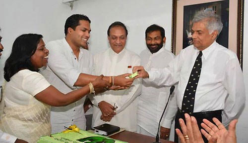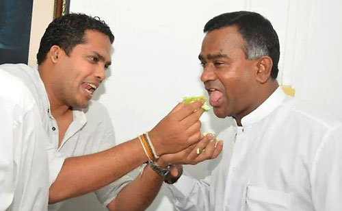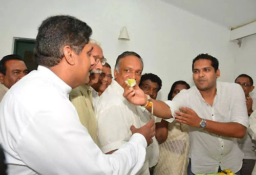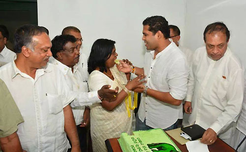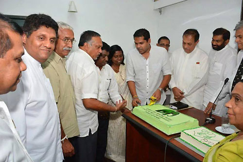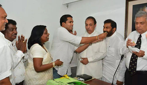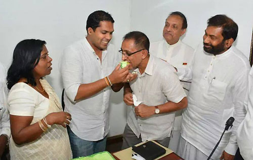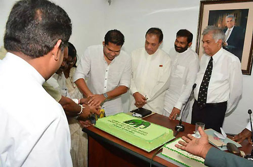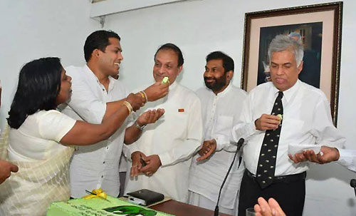 UNP’s Chief Ministerial candidate Harin Fernando along with the United National Party heavyweights celebrated his triumph at the Uva Provincial Council Election concluded on Saturday at Sirikotha, UNP Headquarters last evening (23 September). Harin Fernando was a picture of humility as he celebrated his victory with a brief cake-cutting ceremony which they shared themselves here, thanking his party leadership and colleagues and supporters for their unconditional support in the Uva election. Opposition Leader Ranil Wickramasinghe, newly appointed Deputy Leader Sajith Premadasa, Karu Jayasuriya, General Secretary Tissa Attanayake, UNP National Organiser Daya Gamage, Iran Wickramaratne, Ravi Karunanayake, and large number of UNP parliamentarians and supports were present at the occasion.