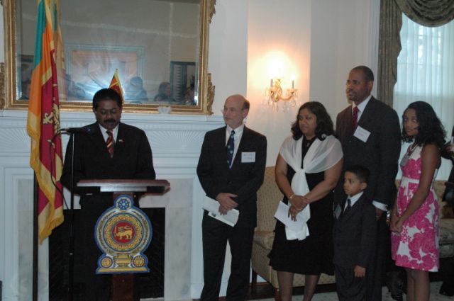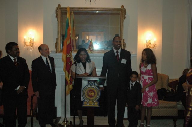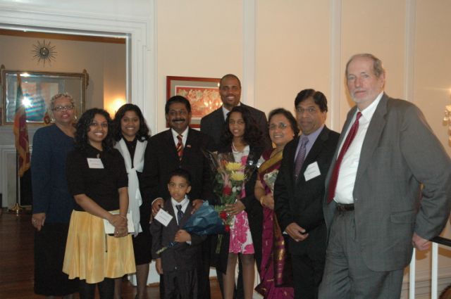 Symbolize Sri Lanka's Promise for the Future The Ambassador of Sri Lanka hosted Ms. Esther Benjamin, her family and friends for dinner recently to recognize Ms. Benjamin’s selection as American University’s School of International Service’s alumna of the year. Ms. Benjamin, who is a native of Sri Lanka, was welcomed to the April 19 reception by Ambassador Jaliya Wickramasuriya at his residence in Washington, D.C. The Ambassador noted how proud all Sri Lankans are to see a fellow Sri Lankan achieving success on the international stage. He further mentioned that a former ambassador to the U.S., Mr. Jayantha Dhanapala, was similarly honored in 2003 by American University, and that Ms. Benjamin may follow in the same foot steps. Ambassador Wickramasuriya noted that Ms. Benjamin’s represents the reality of harmony in Sri Lanka, an ideal he said is the key to lasting peace there. “You are a beacon of hope for all Sri Lankans as you take such great leaderships roles in your community and in your professional circles,” the Ambassador said. Ms. Benjamin is currently executive director for resource development at the International Partnership for Microbicides. IPM is a non-profit product development partnership (PDP) established in 2002 to prevent HIV transmission by accelerating the development and availability of a safe and effective microbicide for use by women in developing countries. Benjamin was also recently a member of President Barack Obama’s presidential transition national security team. Prior to that, Ms. Benjamin was the vice president of business development for the International Youth Foundation. In 1999, President Bill Clinton named Benjamin a White House Fellow. She worked during that period with the U.S. Secretary of Labor on international programs. Mr. Louis W. Goodman, the Dean of American’s University’s SIS, also praised Ms. Benjamin’s accomplishments. In her remarks, Ms. Benjamin mentioned that she came from a small village in Sri Lanka, Murunkan, to the United States to continue advanced studies. During her talk she also recalled her village fondly, noting the support it gave her to come to the U.S. to continue her studies. The ceremony was concluded with a Sri Lankan dinner hosted by the Ambassador.