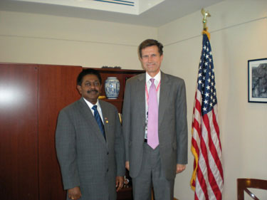 Ambassador Robert Blake, new Assistant Secretary of State for South Asia and Central Asia told at the hearing of the Congressional Subcommittee on South Asia, today that Sri Lanka won an “important victory in the North” when it defeated the Liberation Tigers of Tamil Eelam. Assistant Secretary Blake, testifying before the House of Representatives Subcommittee on the Middle East and South Asia, called on Sri Lanka to quickly resettle the 300,000 internally displaced persons in the North and to hold provincial elections. “The action the Sri Lankan government takes now,” Assistant Secretary Blake said, “in the aftermath of the war, with respect to both humanitarian relief and political inclusion for minorities, will be important to securing an end to terrorism and a lasting peace.” During the hearing, Subcommittee Chairman Gary Ackerman (D-New York) said that, “I think the United States should offer its assistance to relieving the suffering of the displaced as much as we can and, while fully respecting the sovereignty of Sri Lanka, should encourage true national reconciliation.” Jaliya Wickramasuriya, Sri Lanka’s Ambassador to the U.S., met with Blake at the U.S. State Department a day before the hearing to congratulate Blake on his confirmation to his new post by the U.S. Senate. The Ambassador and Blake spoke about the Humanitarian issues in Sri Lanka, particularly resettlement of internally displaced people (IDPs) and plans for redevelopment and elections in the North. Secretary Blake urged not only the speedy resettlement of the IDPs, but also a political process that gives the Northern Province a voice in the national government. He noted that the 13th Amendment to the Sri Lankan Constitution would do that, but that the amendment has to be fully implemented. Blake also said that other measures to promote national unity are under consideration. Specifically, he mentioned a proposal to form an Upper House of Parliament made up of provincial representatives, and the conclusion of the All Party Conference. Those measures, he said, “would help to achieve political reconciliation.” Ambassador Wickramasuriya said that Blake’s confirmation as Assistant Secretary of state for Central and South Asia is a positive development for Sri Lanka, which Blake knows well. Blake served as U.S. Ambassador to Sri Lanka and the Maldives from 2006 until just last month, when he took up his new post in Washington. “Ambassador Blake has seen the situation in Sri Lanka change dramatically during his service there,” Ambassador Wickramasuriya said. “He knows what Sri Lankan citizens have lived through, and the challenges that we face in the years to come. He is a fair-minded person who understands what it will take to ensure lasting peace and reconciliation.” During his meeting with Ambassador Wickramasuriya, Secretary Blake noted that several thousand elderly and disabled IDPs have been allowed to leave government welfare centers, that aid group access to the centers was improving, that restrictions on coastal fishing in the north had been lifted and that two non-governmental organization forums in Colombo and Vavuniya have been established to explore civilian protection and humanitarian issues.