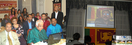 The July 18 event occurred simultaneously at the homes of Ambassador Jaliya Wickramasuriya and five diplomats assigned to the Embassy of Sri Lanka in Washington, D.C. The diplomats invited local Sri Lankans to their homes to enjoy traditional food and learn about the Ministry of Defense’s Api Wenuwen Api Ranaviru Housing Project Fund. Gotabaya Rajapaksa, Sri Lanka’s Secretary of Defence, spoke to the crowded house parties simultaneously via a Webex internet link. He also answered questions from guests about the housing program and the successful conclusion of the nearly 26-year-long conflict with the Liberation Tigers of Tamil Eelam. “Because of all their hard work, it’s very important to meet their every need,” Defense Secretary Rajapaksa said of the armed forces members. “We need to remember the people who have lost their lives for the sake of the country.” Defense Secretary Rajapaksa thanked those who gave to the housing project and said that more homes were under construction for, “our war heroes.” The program also helps families of soldiers killed in the conflict. He added that schools with gymnasiums, auditoriums and computer labs were under construction in the villages of returning soldiers. The Api Wenuwen Api fund, he said, is the backbone of that effort. The funds are needed because members of the armed forces have difficulty buying homes without a guarantor. Banks do not want to risk backing defense personnel, whose lives are considered vulnerable. The Api Wenuwen Api Ranaviru Housing Project Fund takes on the responsibility as the guarantor, and will contribute 1/3 (about US $6000) of the expense of constructing each house. This fund is not controlled by the government, but by a Board of Trustees formed under a Parliamentary Act. This board consists of distinguished persons under the Ministry of Defence. Following Defense Secretary Rajapaksa’s talk, participants generously wrote checks and signed pledge cards. The total amount of money raised for the Api Wenuwen Api fund throughout the U.S. in 2009 now stands at more than $200,000. Ambassador Wickramasuriya called the evening’s events the, “perfect private-public partnership. Now that we have done this, others will be able to do it on their own, raising even more money for homes for soldiers and their families.” The Ambassador said that it was possible to raise $1 million a year to fund the construction of 50,000 new houses in Sri Lanka. He said Sir Lankans in the U.S. will also hold events at their homes to support the Api Wenuwen Api program. In some cases, generous donors contributed enough to pay for a whole house. Others teamed together to pay for one house.
