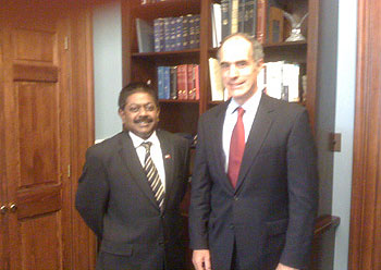 Senator Casey and Ambassador Wickramasuriya discussed Sri Lanka’s reconciliation efforts and the conditions of the centers for civilians displaced by the conflict with the Liberation Tigers of Tamil Eelam. Ambassador Wickramasuriya explained Sri Lankan President Mahinda Rajapaksa’s plan for redeveloping the Northern province following the government’s victory in May over the LTTE. He also informed Senator Casey of the progress made in the centers for Internally Displaced Persons (IDPs), and of the government’s plan to return most of the IDPs to their homes within 180 days. Senator Casey was pleased to hear that 10,000 IDPs have already been resettled in the northern cities of Jaffna and Mannar, and that 10,000 senior citizens have been moved to the homes of relatives or homes for the elderly. Ambassador Wickramasuriya advised that such resettlements are continuing on a daily basis. The Ambassador also stressed the need to return civilians to communities that are free of landmines and weapons concealed by the LTTE. He described the urgent need for assistance in Sri Lanka’s de-mining efforts. Senator Casey pledged the US support for de-mining efforts in the North, noting that the resettlement of the IDPs was essential. Ambassador Wickramasuriya also briefed Senator Casey on the Aug. 8 regional elections as a first step toward the implementation of a political solution to reconcile differences with Sri Lanka’s Tamil population. At the conclusion of the very positive meeting, Ambassador Wickramasuriya urged Senator Casey to speak to a broad cross section of Tamil Sri Lankans living in the US. He also invited the Senator Casey to visit Sri Lanka to assess the situation.