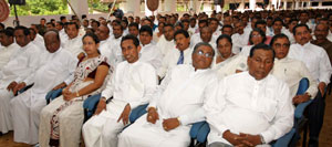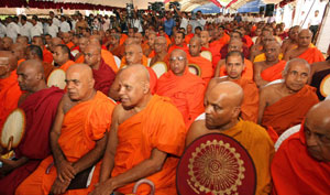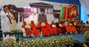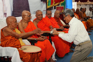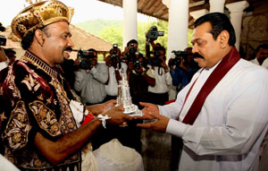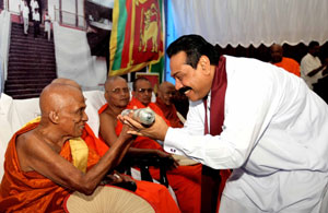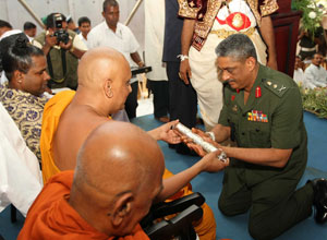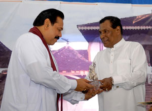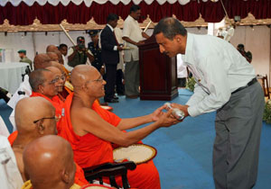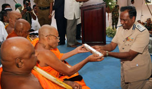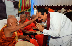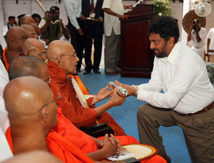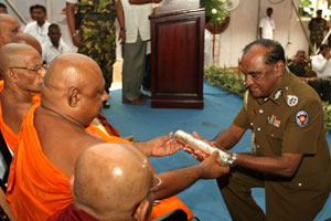 Venerable Maha Sanga, Defense Secretary Mr. Gotabaya Rajapaksa, Chief of Defence Staff and former Army Commander Gen Sarath Fonseka, former Navy Commander Admiral Wasantha Karannagoda, many politicians and Sabaragamuwa people were participated the colourful ceremony. Elimination of terrorism does not gurantee total national security as we all wished. If government aimed at short term petty political gains on what our war heroes have achieved by sacrifising their valuable lives, then this outstanding victory would not have materialised. President Mahinda Rajapaksa made these comments addressing the felicitation ceremony for war heroes at Saman Devalaya in Ratnapura. He further said that the government has implemeted a massive programme to re-build the country which was destroyed by brutal terrorism for last 30 years. He noted that the bravery of the vialent war heroes and the enthusiasm displayed by the people to defeat the terrorism is also vital when rebuilding the country. Sri Lankan people who have understood this fact are ready to unite under one flag disregarding party politics for the sake of national unity. All political leaders and political parties also should realise this simple fact and extend their fullest support towards development, President further added. Chief Sanganayaka of Sabaragamuwa of Malwaththa Chapter Ven. Vehalle Aththadassi Nayaka Thero bestows the sannas pathraya to the President. Ven. Hadapangoda Wimalanayaka Thero felicitated Defense Secretary Mr. Gotabaya Rajapaksa. Minister W. J. Senevirathne presented a Memento on be half of the People of Sabaragamuwa to President. Chief Minister Mr. Mahipala Herath also presented a memento to President. Former Army Commander Gen. Sarath Fonseka, former Navy Commander Admiral Wasantha Karannagoda, former CDS. Admiral Donald Perera, I.G.P Jayantha Wicremarathna, Director General of Civil Defence Rear Admiral Sarath Weerasekara were also felicitated at the ceremony. (Pix: Sudath Silva)