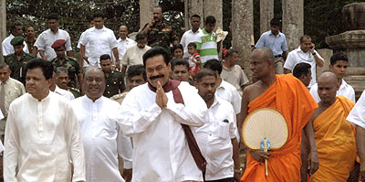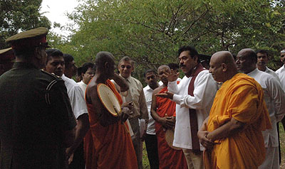 President Mahinda Rajapaksa visited Anuradhapura to inspect the land in Mahamevna Uyana where a new Dagaba is to be built as a monument to the country's victory over brutal terrorism. President also visited 'Atamasthana' and paid homage to the sacred Sri Maha Bodhi on 30th September. President was there with his delegation to inspect the land under the programme of 09 Dagabas to be build in the 09 provinces of the country to symbolised the triumph of defeating terrorism. The First Dagaba has proposed to built near the Sri Maha Bodhi sacred area.