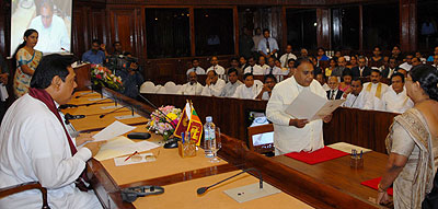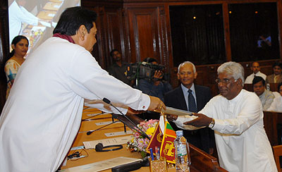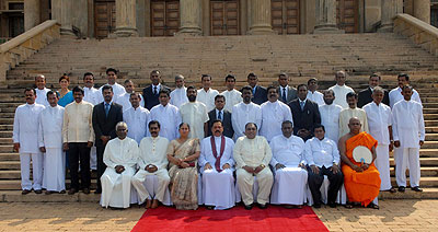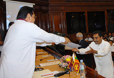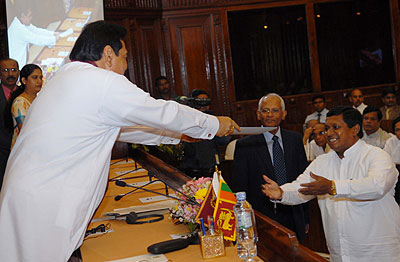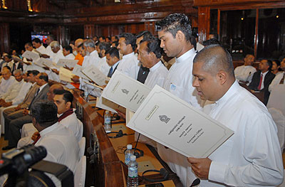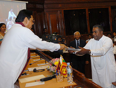Former Chief Minister of the Province, Shan Wijayalal De Silva was sworn in once again as the Chief Minister. He is also functioning as the Minister of Finance and Planning, Justice and Law, Transport, Drainage and Water Supply, Power, Engineering Services, Health, Indigenous Medicine, and Local Government. Meanwhile other Provincial Ministerial portfolios have been assigned to several other following contestants those who contested under UPFA banner. Mr Hemal Gunasekara as Minister of Southern Province - Land, Land Development, Irrigation, Highways, Mass Media, Rural Infrastructure, Mr. V. K. Indika as Minister of Southern province Education, Cultural Trade and Development Co-operative Development, Mr. Dayawansa Ariyathilake Gamage as Minister of Southern Province Sports, Youth Affairs Rural industry, Tourism, Housing and Construction and Mr. Bindu Weerasinghe as Minister of Southern Province Agriculture, Livestock and Livestock Development, Fisheries and Environment. Mr Shan Wijayalal, lawyer by profession who won majority of votes in the recently held Southern Provincial Council Elections, assumed duties first as the Chief Minister of Southern Province in 2004. President Rajapaksa addressed the ceremony and said that all must respect the verdict given at the recent election and all must get together to serve the people disregarding all differences. Any person who is not satisfied with the verdict could go to the courts. The President reiterated that there is a possibility of providing a part of the expenses needed for taking up such legal actions. Pix: Chandana Perera