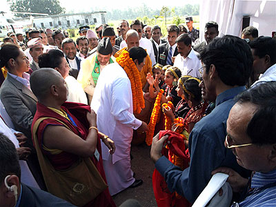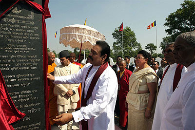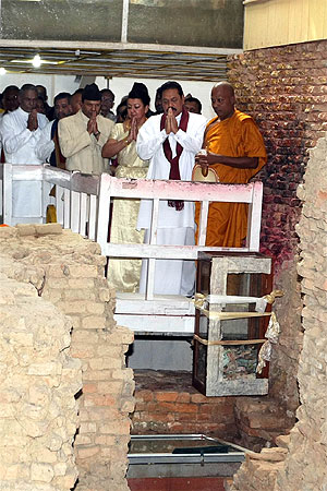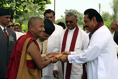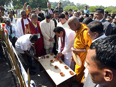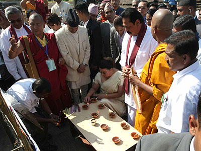 Nepalese children welcomed the President and the Sri Lankan delegation on arrival at one of the most holiest places for Buddhists all over the world. President lit up oil lamps near Asoka Pillar,which was discovered in 1896 by Nepalese archeologists. The great stone pillar at the site, marks the spot of Emperor Asoka's visit to Lumbini during 269 to 232 BC. President Rajapaksa officially opened the newly built Sri Lankan Monastery funded by Sri Lanka Lumbini Development trust.Later he donated One Million US Dollas for Sri Lanka Lumbini Development trust to the Minister for Federal Affairs,and Culture Dr.Minendra Rijal of Nepal . President of the Sri Lanka Lumbini Development Trust,Minister Chamal Rajapaksa, Tissa Karaliyadda and the Sri Lankan delegation were present at the religious ceremony. Lumbini, Gautham Buddha's birth place is a Buddhist pilgrimage site in the Kapilavastu district of Nepal, near Indian border. In 1997 UNESCO specifically nominated Lumbini as a World Heritage Site under the International World Heritage Programme. Pix: Sudath Silva
