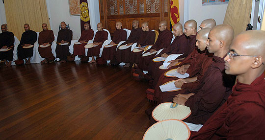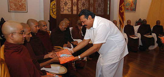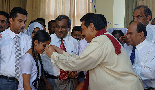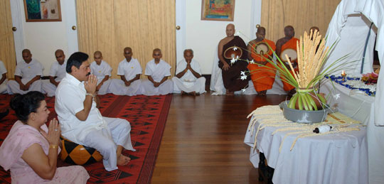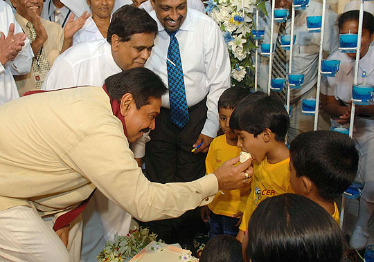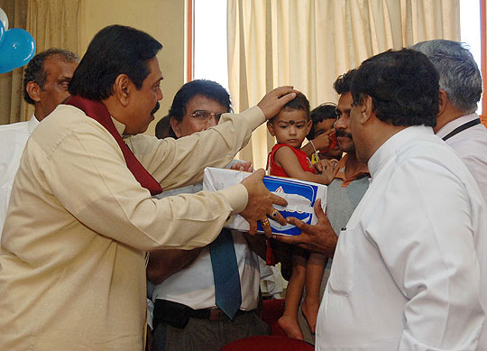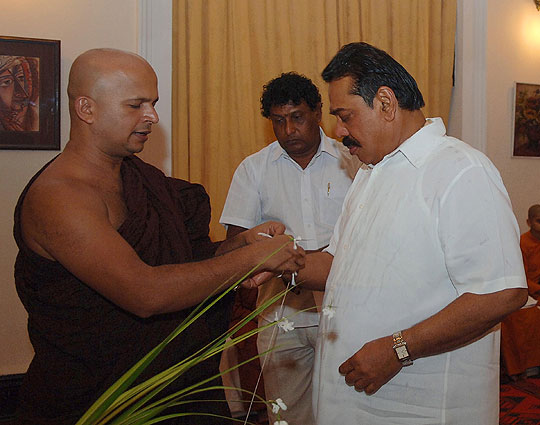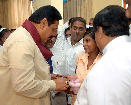 Many religious programmes are planned to celebrate and invoke blessings on the Head of State Island wide. Venerable Maha Sanga including Uduwe Dhammaloka thero chanted Seth Pirith at President’s House in the early hours of this morning to bless the President on his birthday. ‘Everybody should respect the President for leading the country towards historical victory over three decades long war against terrorism’ says the felicitation message issued by Anunayaka Thera of Malwatta chapter Ven.Niyangoda Vijithasiri Thera and all night Pirith Chanting ceremony will be held in Temple Trees tonight. Representing other religious groups, Kurukkal of the Maha Badrakali Hindu Kovil, Rajagiriya Samy Kaly Kanagrathnathiravi said the President is the only leader who united all ethnic communities in the country as one nation. Blessing of the people goes to the President to continue his valuable service to the country said the Catholic priest Rev. Father Sarath Hettiarahchi. Chief incumbent of Colombo main Mosque Moulawi M.S.M.Kathleen pointed out that all Muslim community in the country will respect for the President who initiated Sri Lankan solidarity. President also participated the special celebration organised by the ENT Clinic at Colombo General Hospital and distributed gifts to 64 twins to commemorate his 64th birthday this morning. Born in 1945, President Rajapaksa was first elected to the Parliament in 1970 in the United Freedom Front Government led by Prime Minister Sirimavo Bandaranayake. He was then the youngest member to enter the Sri Lanka Parliament. He was held several important cabinet ministries including the Labour Minister in the Peoples Alliance Government of 1994 and Fisheries and Aquatic Resources Minister from 1997. He served as Prime Minister of Sri Lanka from April 6, 2004 and was sworn in as the 6th Executive President for a six-year term on Nov 19, 2005. Pix by: Nalin Hewapathirana and Chandana Perera