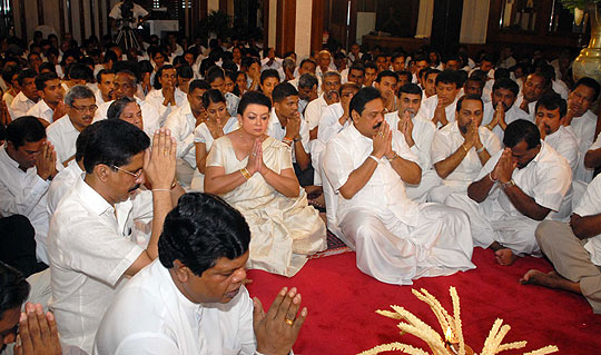 President Rajapaksa also spent his birthday engaging in various religious observances yesterday. Last evening he attended a special Bodhi Puja at Bellanwila Raja Maha Viharaya and a Buddhist sermon was delivered by the Viharadhipathi of the Temple, Venerable Professor Bellanwila Wimalarathana Thero. Another religious ceremony was held at the Kirivehera Raja Maha Viharaya in Kataragama yesterday to invoke blessings on the President, the country and the valiant Armed Forces. All night Pirith Chanting was organised and alms giving ceremony was held this morning at the Kirivehera Temple premises. Minister Wadiwel Suresh MP, representing upcountry Tamils wished and garlanded the President in Hindu traditions. TNA parliamentarian Mr Sivanadan Krishna MP also wished the President on his birthday at Temple Trees. The Seth Pirith Chanting ceremony at Presidential Secretariat was organised under the patronage of Mr Lalith Weeratunga, Secretary to the President. First Lady Shiranthi Rajapaksa, Defence Secretary Mr Gotabaya Rajapaksa, the Speaker Mr. W. J. M. Loku Bandara and many others were present at the religious ceremony. Pix By: Sudath Silva and Nalin Hewapathirana