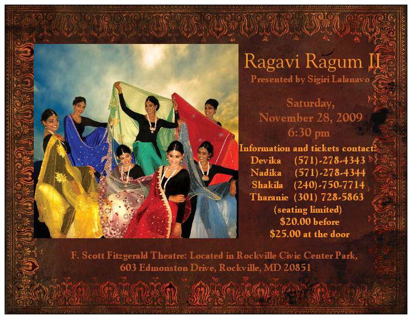 “Ragavi Ragum II” will be staged at the F. Scott Fitzgerald Theater at the Rockville Civic Center Park at 6.30 p.m. on Saturday, November 28, 2009. The professionalism of the dancers and their taste for fantasy and shimmering color combine a recipe for another magical evening. The audience will be treated to unique combinations of dance and music, like modern ballet accompanied by string instruments, and traditional Kandyan dancing set to Sri Lankan modern age songs. The Lalanavo are proud of their creation of Bharatha Natyam and modern ballet, set to A.R. Rahman’s music from Slumdog Millionaire. Devika Maduwantha has choreographed the show, while the other members of the group, Manoja and Nadika Wimalkantha, Tharanie Amarawardana, Shakila Balasooriya, Achala Malalasekera, Chanika Dampagedon and Aruni Wijesekera, will transport you to an unforgettable world of beautiful color and graceful movement. Enjoy Ragavi Ragum II.