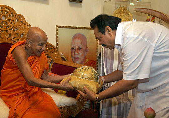Last evening (5th November) the President visited the chief incumbents of Most Venerable Agga Maha Panditha Udugama Sri Buddha Rakkitha Nayaka thero of the Asgiriya Chapter and the most Venerable Tibbatuwawe Sri Siddhartha Sumangala Nayaka thero of the Malwattha Chapter and engaged in several religious activities there. President has briefed the Maha Nayaka Theros of the measures taken by the government recently including the enhancement of Buddhist religious relations with several institutions in countries he visited recently and discussed the political issues and security situation of the country with them. President Rajapaksa frequently visits the two prelates and they have appreciated the work carried out by the President according to the information received. Recently he was awarded a special title “Vishva Keerthi Sri Thri Sinhaladishvara” by the prelates of the Malwattha and Asgiriya Chapters, the highest respected award presented to a citizen in the country at Magul Maduwa, Kandy. President also engaged in several religious activities at the Sri Dalada Maligawa this morning. Ven.Tibbatuwawe Sri Medankara Thero,Ministers Athauda Senevirathne,Chief Minister Sarath Ekanayake,Diyawadana Nilame Pradeep Nilanga Dela Bandara also participated the religious observances at the Maligawa. After paying homage to the Sacred Tooth Relic of the Lord Buddha this morning, the President visited Galaha to join the opening ceremony of the newly built Bhikku Hospital for Maha Sanga. (Pix By: Sudath Silva)