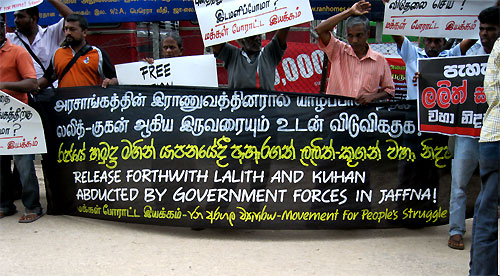 JVP dissidents said yesterday that former LTTE cadres had joined hands with them in political work in the Northern Province, and their activist Kugan Maruganathan who was abducted on December 9, last year was also involved in the activities of the organisation at that time. JVP dissident Udul Premaratne, who is an executive member of the organisation, 'We are Sri Lankans,' said that there were around 900 political prisoners in the country, and that he interacted with 500 of them. Mr. Premaratne, who is also a former convener of the Inter University Students' Federation said that ex-combatants of the terrorist outfit would be encouraged to join hands with his political movement. "We must make it clear that former LTTE members are now with us. We should not be afraid to say it. We should announce it to the world come what may. We do not approve of separatist terrorism. We do not do politics with any separatist organisations. Yet, we are with the ex-combatants," he said. He said that it had been difficult for the dissidents to convince the former LTTE activists initially because the members of his political movement had supported the war against terrorism in the past. "However, we explained to them that the real cause of the problem lay elsewhere. We admitted that they had a problem merely because they were Tamils. Yet, the root cause of the problem is class distinctions -- the gap between the rich and the poor. There is a class problem. We must address this issue," he said. Also, Mr. Premaratne noted that unless political opportunities were created for the former members of the LTTE, they would be driven towards separatism again. "The LTTE has been decimated here. However, it is active in other parts of the world. These elements can win over these former LTTERS unless they are absorbed into the political mainstream here," he said. Asked about the abduction of Kugan and Lalith Kumar Weeraraju on December 9 last year, he said that the issue had been taken up with the UN. "The UN has started inquiries. We will pursue the case," he said. Source: Daily Mirror - Sri Lanka