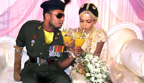 In one of the most significant acts that symbolizes the power of true love, a 23-year-old army soldier who had lost both his eyesight and right arm in the war, tied the knot with his 18-year-old fiancée at the ‘Abhimansala Ranaviru Resort’ in Anuradhapura yesterday. Lance Corporal Charith Kularuwan Kulatillaka of Wellamorana, Mihintale was caught in the explosion of an anti-personal mine during the last phase of the war in Kilaly while his bride was Suvini Sewwandi from Ragama. The two had met each other while travelling in a bus to Ragama when Charith was receiving treatment at the Ragama Ranaviru Centre. Sewwandi had realized that he was a soldier maimed by the war and asked for his contact number. Their accidental acquaintance had bloomed into a love affair later on. Army Commander Jagath Jayasuriya and his wife Mallika Jayasuriya, Ministers S. M. Chandrasena, Felix Perera and Deputy Minister W. B. Ekanayake participated in the wedding ceremony. Charith had joined the army as a soldier of the Wijayaba Infantry Regiment on May 5, 2007. After training, he joined the final battle against terrorism. He was caught in the explosion of an anti-personal mine on November 18, 2008 during an operation to break forward defence lines of the LTTE in Kilali. After being injured seriously, he was airlifted to the Sri Jayawardenapura Hospital. Though he survived after medical treatment, he could not regain his eyesight while his right arm was also amputated. He had been transferred to the Ragama Ranaviru Sevana after initial treatment at the Sri Jayawardenapura Hospital. He had met Sewwandi in a bus on his way to Ragama once during this period. During their days as lovers Sewwandi had promised to love, cherish and look after Charith right throughout her life. And in return, besides all the handicaps Charith possesses a pure heart that can pour out true love and affection to Sewwandi right through his life. Sewwandi is the elder daughter of Sisira Senaratne and Aiwa Shiromi Zoysa of Gane Road, Ragama. Their wedding took place amidst the blessings of their parents. The ceremony was organised by Col. Kanishka Bandara. Meanwhile, a philanthropist from the area who attended the wedding offered to build a house for the new couple. Source: Daily Mirror - Sri Lanka